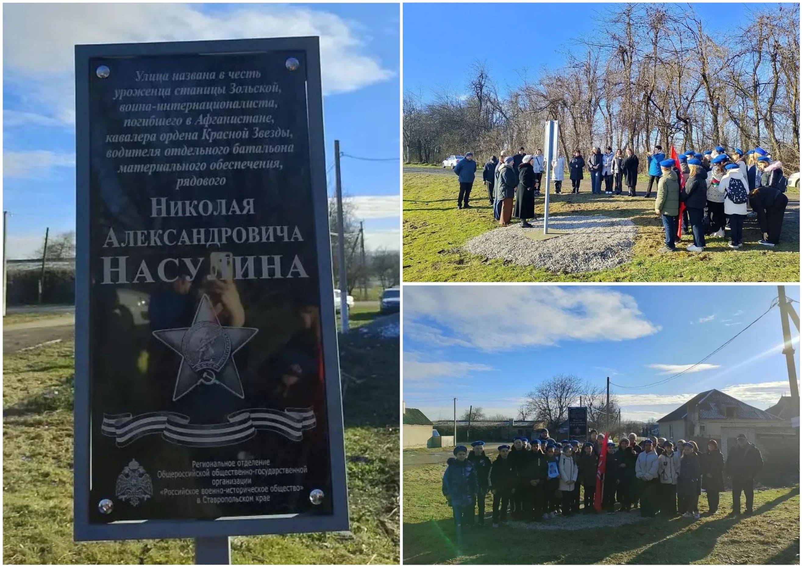 15 декабря 2025 г. в ст. Зольской состоялось открытие мемориальной доски уроженцу станицы, воину-интернационалисту, погибшему в Афганистане, кавалеру ордена Красной Звезды, водителю отдельного батальона материального обеспечения, рядовому Н.А. Насулину. Открывала памятную доску родная сестра павшего воина – Н.А. Лукошкина.