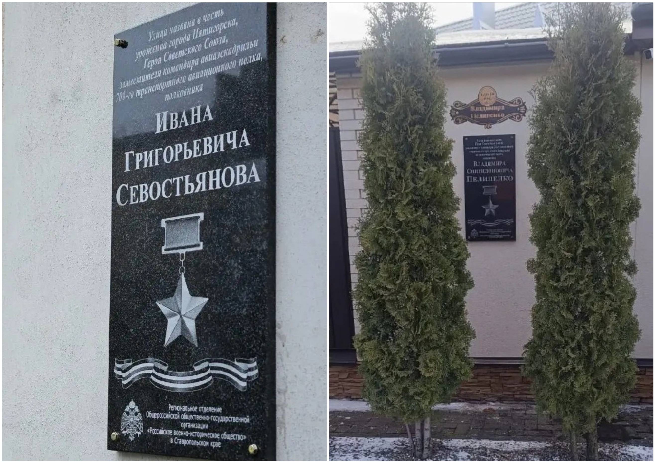 Так, новые памятные объекты появились на улицах Пятигорска (председатель Местного отделения РО РВИО СК – Ворошилов Д.Ю.), носящих имена: Героя Советского Союза, командира 77-го стрелкового корпуса, генерал-лейтенанта П.М. Козлова; уроженца Пятигорска, Героя Советского Союза, заместителя командира авиаэскадрильи 708-го транспортного авиационного полка, полковника И.Г. Севостьянова; Героя Советского Союза, заместителя командира 24-го отдельного штурмового стрелкового батальона по политической части 59-й армии 1-го Украинского фронта, майора В.С. Пелипенко; уроженца Пятигорска, Героя Советского Союза, командира звена 177-го гвардейского истребительного авиационного полка, полковника А.Д. Догадайло. Мемориальные доски были торжественно открыты 9 декабря 2025 г., в День Героев Отечества.