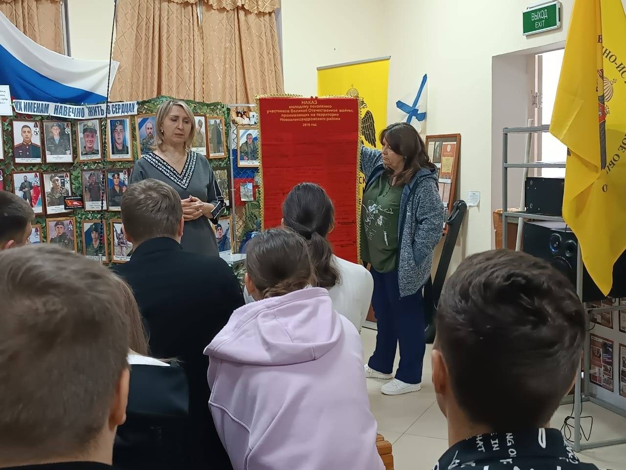 В этот день обе выставки посетили учащиеся 9-10 классов МОУ СОШ №3 г. Новоалександровска и МОУ СОШ №11 х. Красночервонного. Сотрудники музея, члены РО РВИО СК, провели увлекательные экскурсии по этим выставкам, познакомили ребят с отдельными, наиболее интересными экспонатами и подробно рассказали о каждом из них, а также ответили на вопросы учащихся. Были проведены исторические параллели в плане вооружения нашей армии в разные исторические периоды, показаны изменения в средствах военной связи, уделено внимание изменению военной формы и обмундирования солдат в современной армии. Рассказали сотрудники и об основных родах войск Советской Армии и современной Российской Армии. Показали военную форму разных родов войск Советской Армии и Флота.