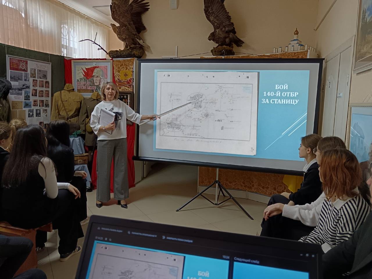 В ходе мероприятия сотрудники музея рассказали школьникам о тяготах оккупации района и края, о том, сколько жертв и вреда принесли фашисты на их родную землю, об освобождении города. Рассказ сопровождался тематической презентацией и демонстрацией видеоклипа, в котором собраны фотографии всех известных освободителей станицы в январе 1943 года.
