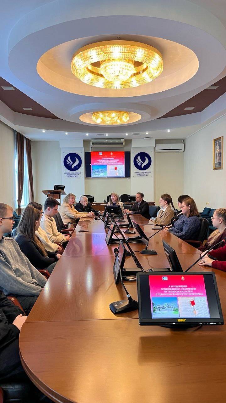 В Северо-Кавказском федеральном университете (СКФУ) под руководством Колесниковой М.Е., д.и.н., профессора, директора Гуманитарного института, зав. кафедрой истории России СКФУ, члена-учредителя РО РВИО СК, состоялись исторические чтения, посвящённые знаковому событию в истории Ставрополя. Участниками круглого стола стали не только студенты-историки, но также филологи и математики. С научными докладами выступили: Судавцов Н.Д., д.и.н., Почётный профессор СКФУ, главный научный сотрудник отдела военной истории и патриотической работы Ставропольского государственного музея-заповедника (СГМЗ), член-учредитель РО РВИО СК; Зозуля И.В., к.и.н., к.ю.н., зам. директора научного департамента СКФУ, доцент кафедры истории России СКФУ, член РО РВИО СК; Стрекалова Е.Н., к.и.н., доцент кафедры истории России СКФУ, старший научный сотрудник отдела военной истории и патриотической работы СГМЗ, член РО РВИО СК. Особый интерес вызвали выступления студентов-историков, которые представили архивные данные о преступлениях оккупантов на территории города. Мероприятие завершилось дискуссией и возложением цветов к мемориалу студентам и преподавателям университета, воевавшим и погибшим в годы Великой Отечественной войны.