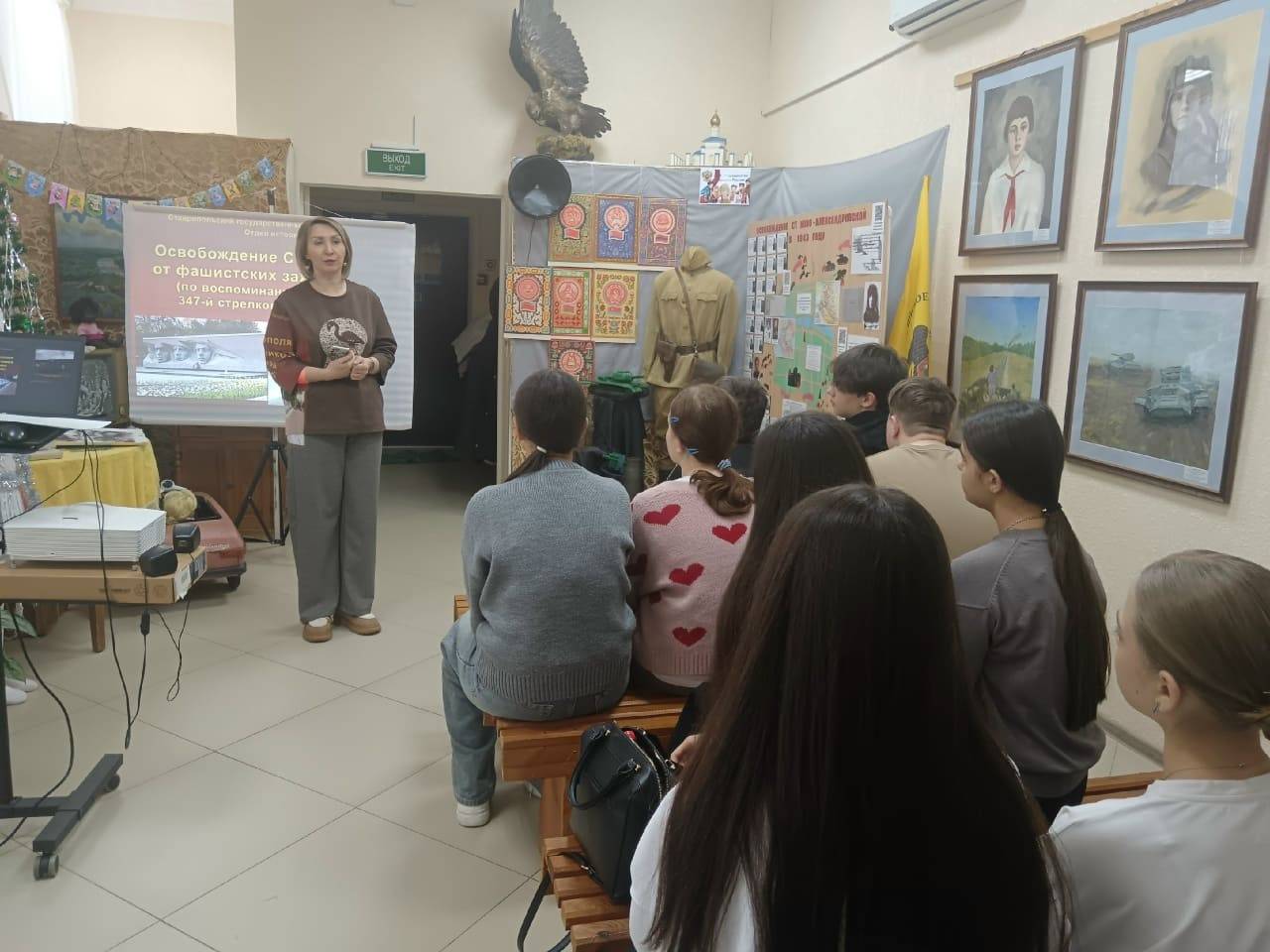 21 января 2026 г. в Новоалександровском районном музее для учащихся 8-х классов состоялась серия лекций, приуроченных к 83-й годовщине освобождения Ставрополья от немецко-фашистских захватчиков. Слушателями стали ученики МОУ СОШ №7 пос. Горьковского и МОУ «Гимназия №1» г. Новоалександровска. Сотрудники музея, члены РО РВИО СК Герасимова М.Ф. и Скрипникова Л.А. рассказали школьникам о тяжёлом периоде оккупации и героическом освобождении родного края, подробно остановившись на судьбе ст. Ново-Александровской. Ребята увидели фронтовые фотографии, карты боевых действий, личные вещи и наградные документы солдат, а также архивные хроники, запечатлевшие оккупацию Ворошиловска (ныне Ставрополя). Особое впечатление на школьников произвела выставка работ воспитанников местной художественной школы «Я на войну смотрю глазами деда». Через детские рисунки трагедия войны предстала в искренних и пронзительных образах, позволив новому поколению эмоционально ощутить всю боль и ужас военного времени.
