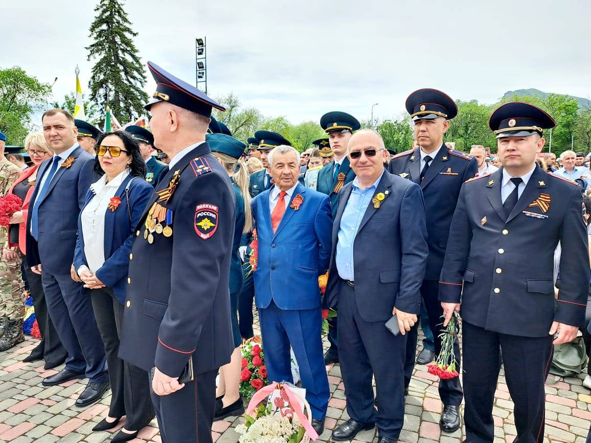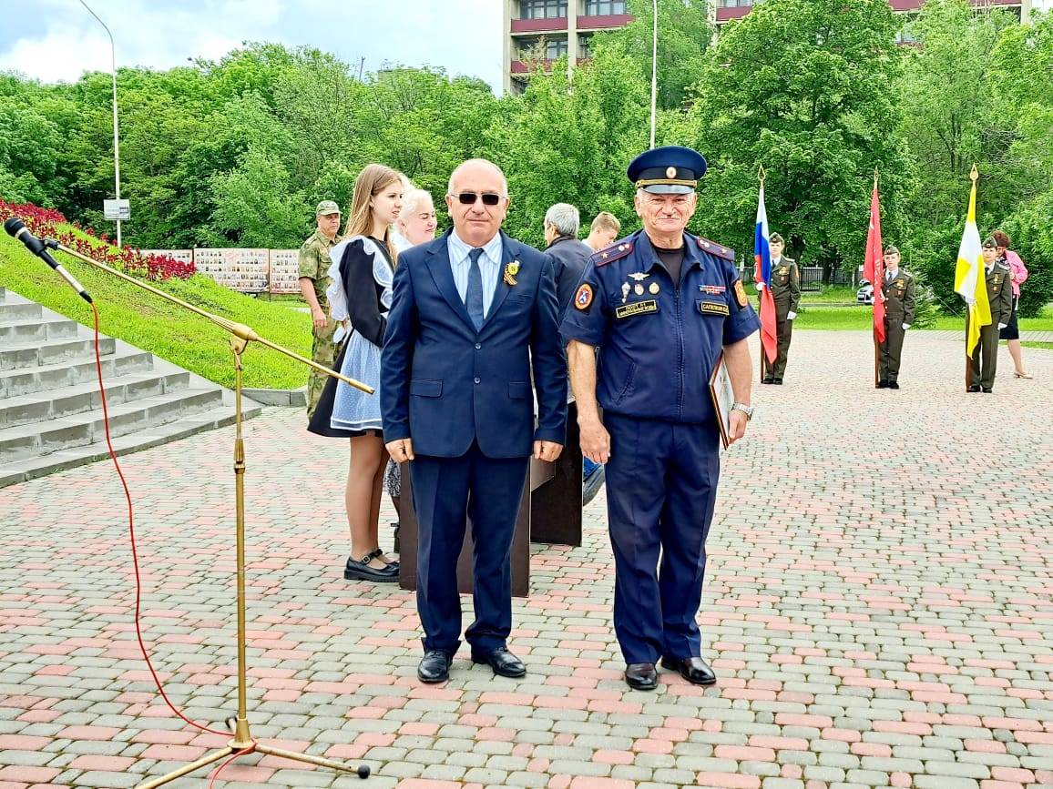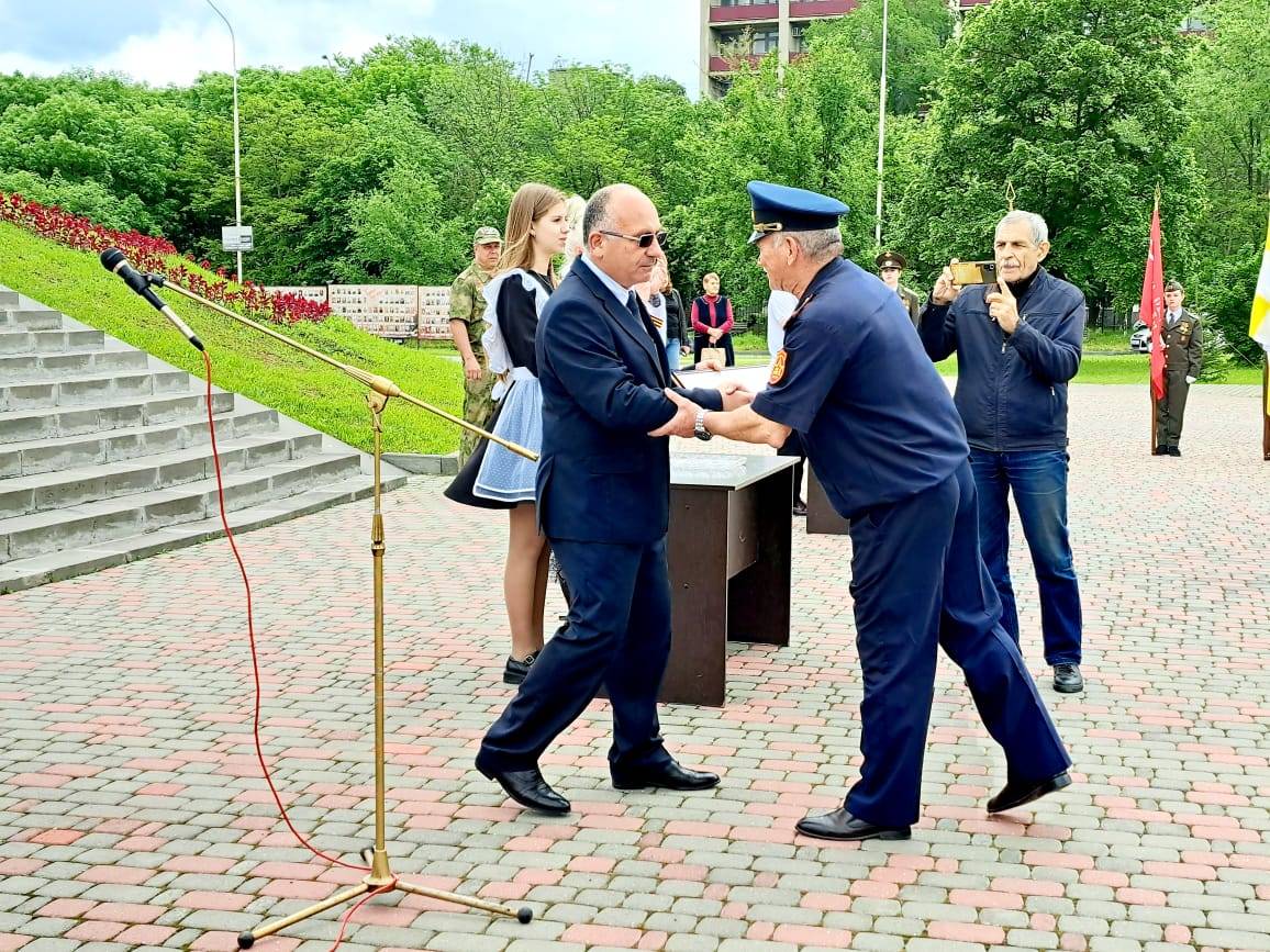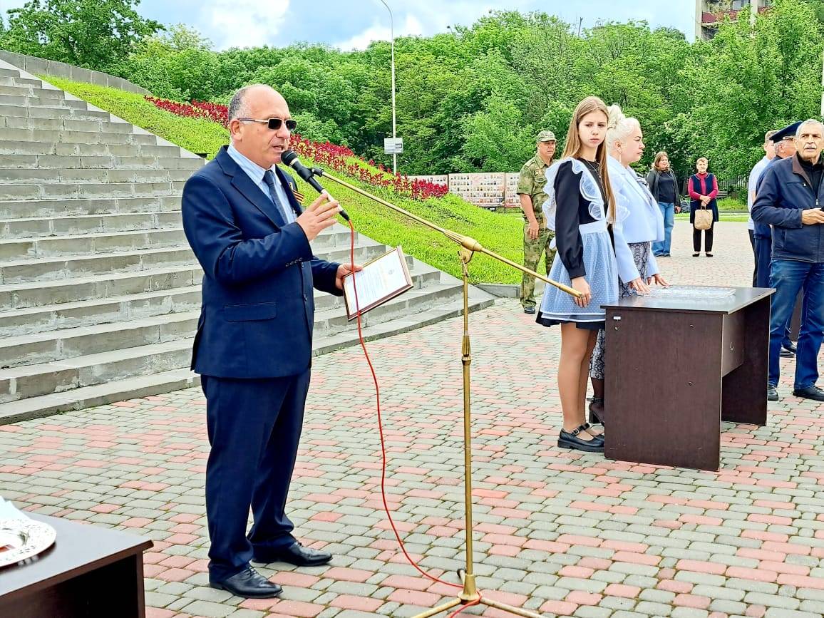 15 мая 2025 г. в Минеральных Водах на территории мемориального комплекса «Огонь Вечной Славы» состоялось торжественное мероприятие, посвящённое закрытию «Вахты Памяти» на Посту №1 и подведению итогов работы по военно-патриотической направленности за 2024-2025 учебный год среди учащихся Минераловодского муниципального округа. В мероприятии принял участие Акопян М.Б., председатель Местного отделения РО РВИО СК в Минераловодском муниципальном округе. Он поздравил школьников и вручил благодарственное письмо руководителю Поста №1 Сапелкину О.Е. за работу в деле военно-патриотического воспитания молодёжи округа.