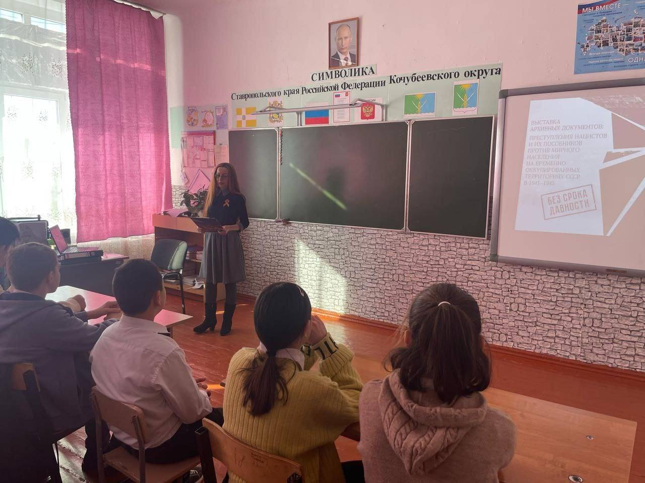 20 февраля 2025 года Яковлева О.Н., руководитель архивного отдела администрации Кочубеевского муниципального округа, член РО РВИО СК, провела для учащихся 5-11 классов МКОУ СОШ N 17 а. Карамурзинский уроки мужества по архивным документам историко-документальной выставке «Без срока давности», подготовленной комитетом Ставропольского края по делам архивов и ГКАУ «Государственный архив Ставропольского края». Школьники ознакомились с документами о геноциде мирного населения, военных преступлениях нацистов и их пособников в годы Великой Отечественной войны 1941-1945 гг.