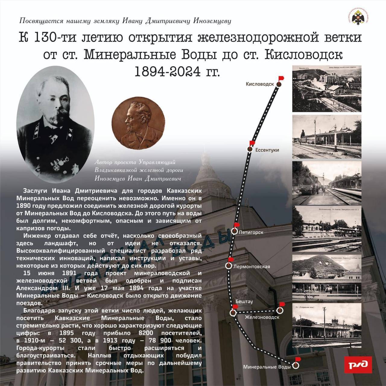 В 2024 году отмечается 130-летие открытия железнодорожной ветки от ст. Минеральные Воды до ст. Кисловодск, строительство которой связано с именем И.Д. Иноземцева, уроженца ст. Григорополисской Ставропольского края. Данная железнодорожная ветка внесла значительный вклад в расширение курортного потенциала Кавказских Минеральных Вод. В 1942 году в ходе наступления немцев на Кавказ железнодорожники обеспечили эвакуацию раненных советских солдат из госпиталей курортов по данной железнодорожной ветке.