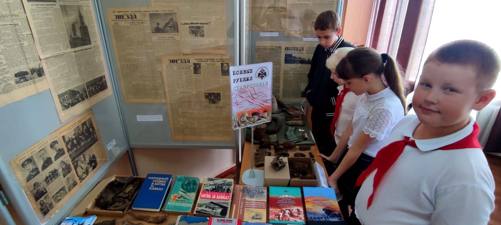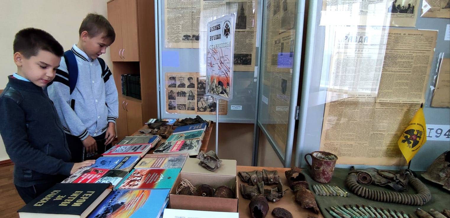 Совместно со школьной библиотекой была подготовлена выставка книг, посвященных истории Битвы за Кавказ, среди которых представлены издания РО РВИО СК.