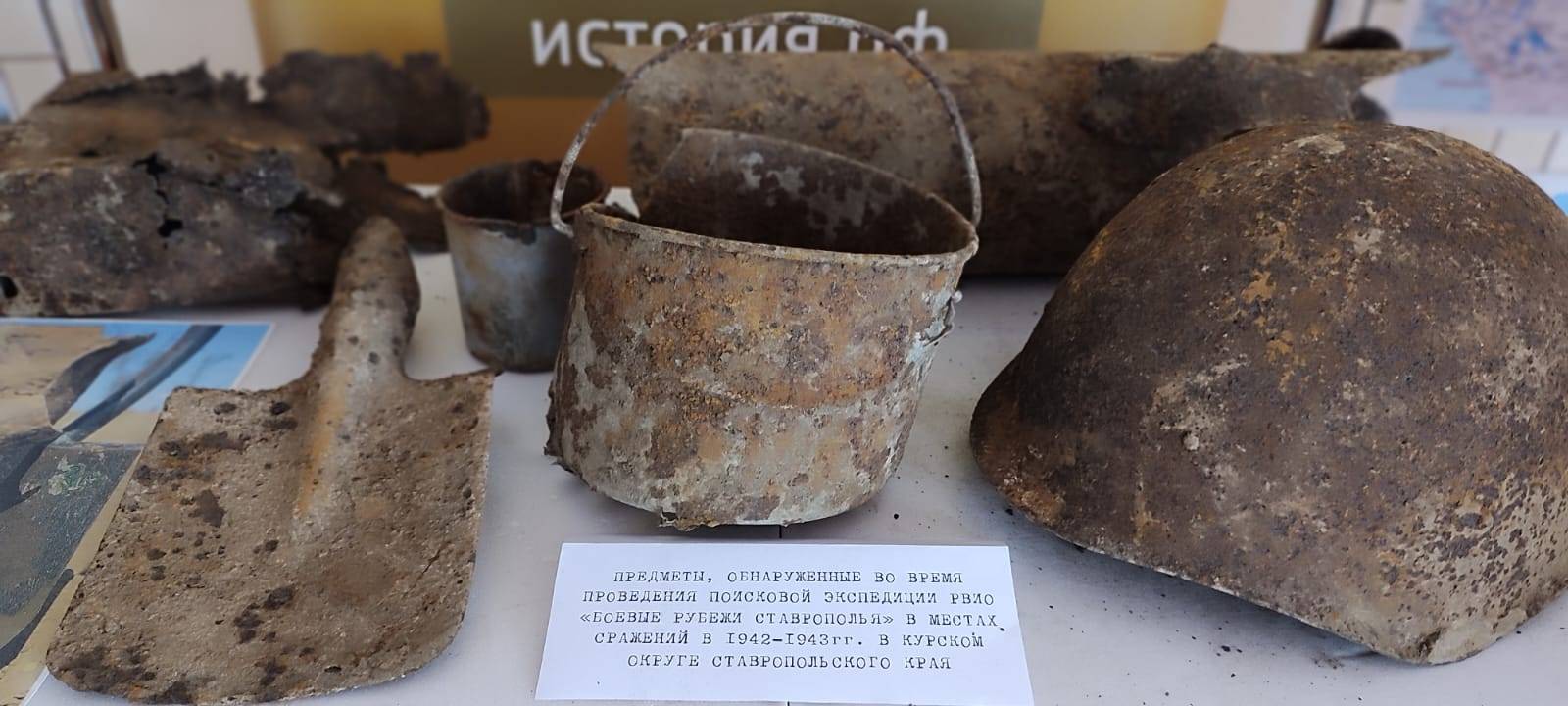 На выставке представлены военно-археологические экспонаты, обнаруженные в ходе поисковых экспедиций РО РВИО СК в сентябре и октябре 2024 года на территории Курского муниципального округа Ставропольского края. Вниманию посетителей представлены фотографии, рассказывающие о работе поисковиков.