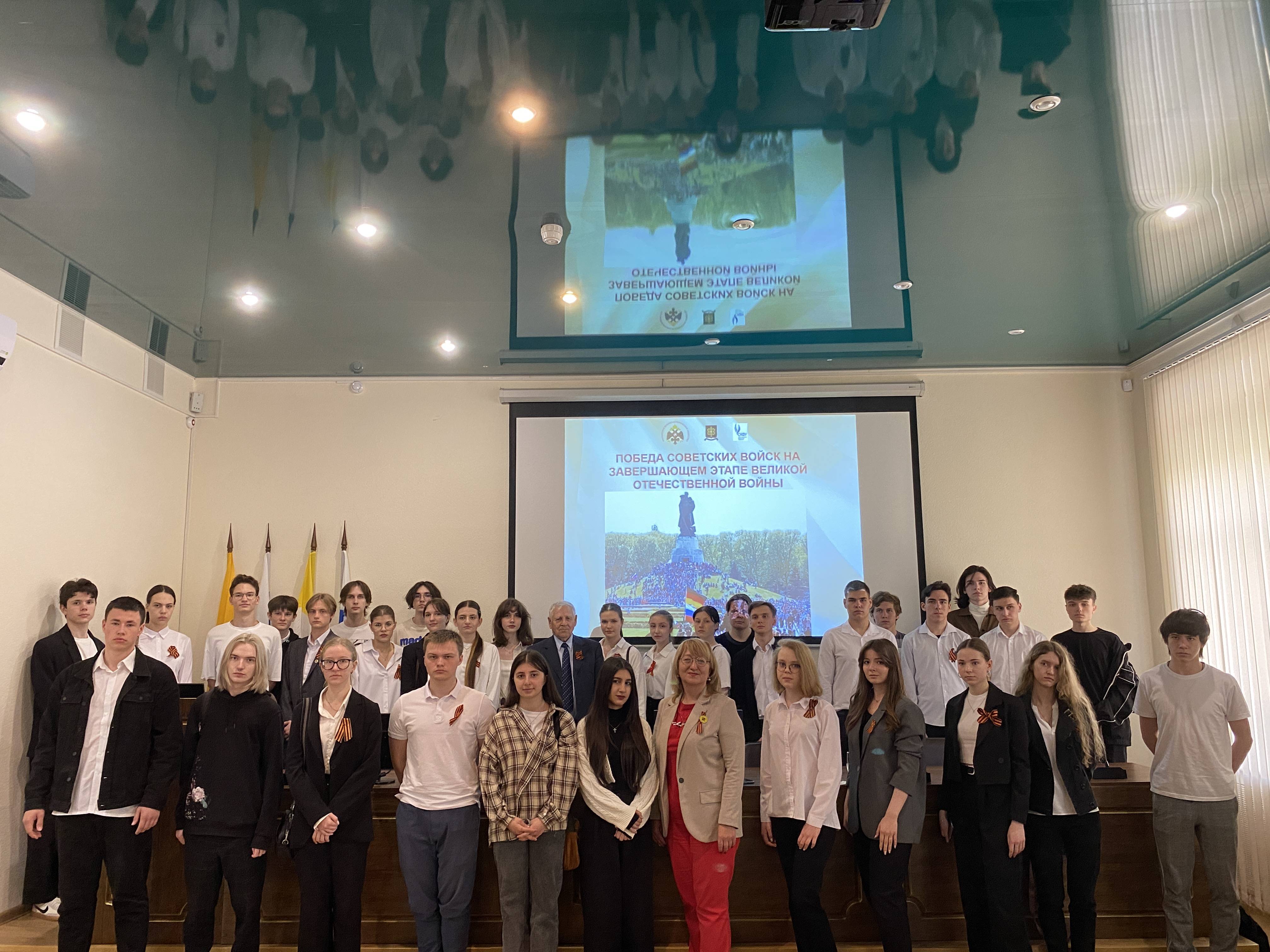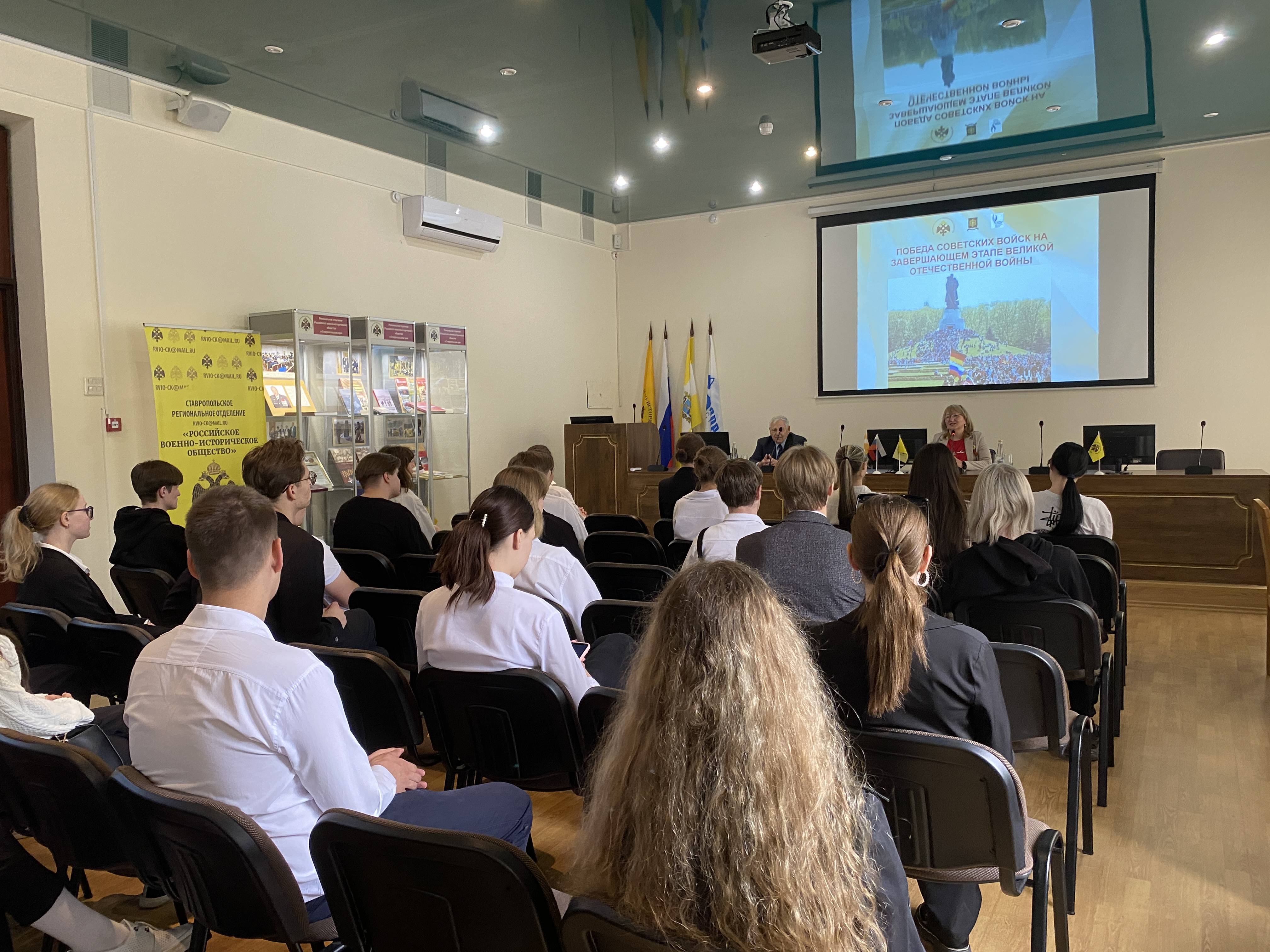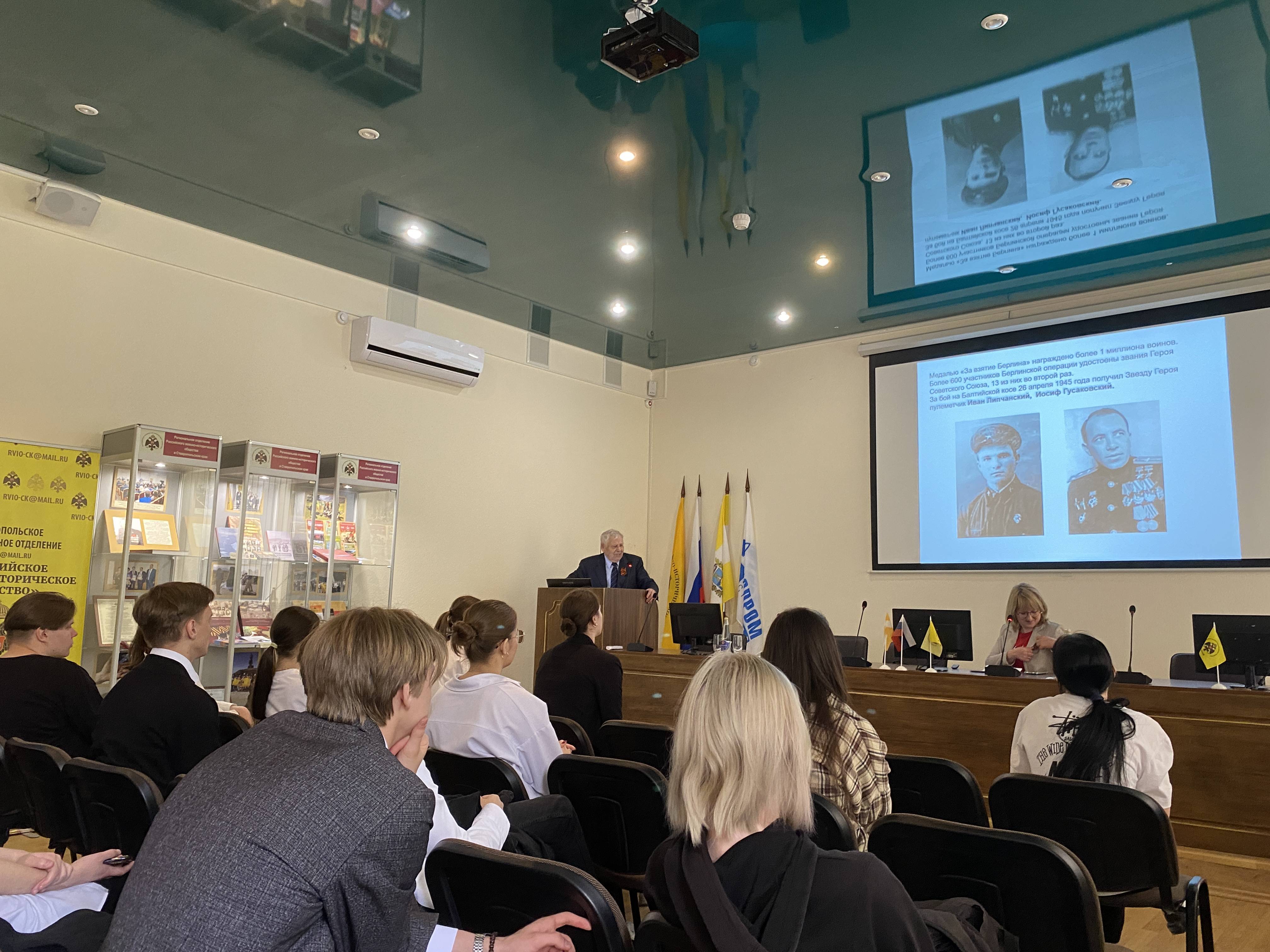 Вместе с лекторами Судавцовым Н.Д., д.и.н., Почетным профессором Северо-Кавказского федерального университета (СКФУ), главным научным сотрудником отдела военной истории и патриотической работы СГМЗ, одним из учредителей РО РВИО СК, и Стрекаловой Е.Н., к.и.н., доцентом кафедры истории России СКФУ, старшим научным сотрудником отдела военной истории и патриотической работы СГМЗ, членом РО РВИО СК, школьники обсудили значение и главные итоги Берлинской наступательной операции.