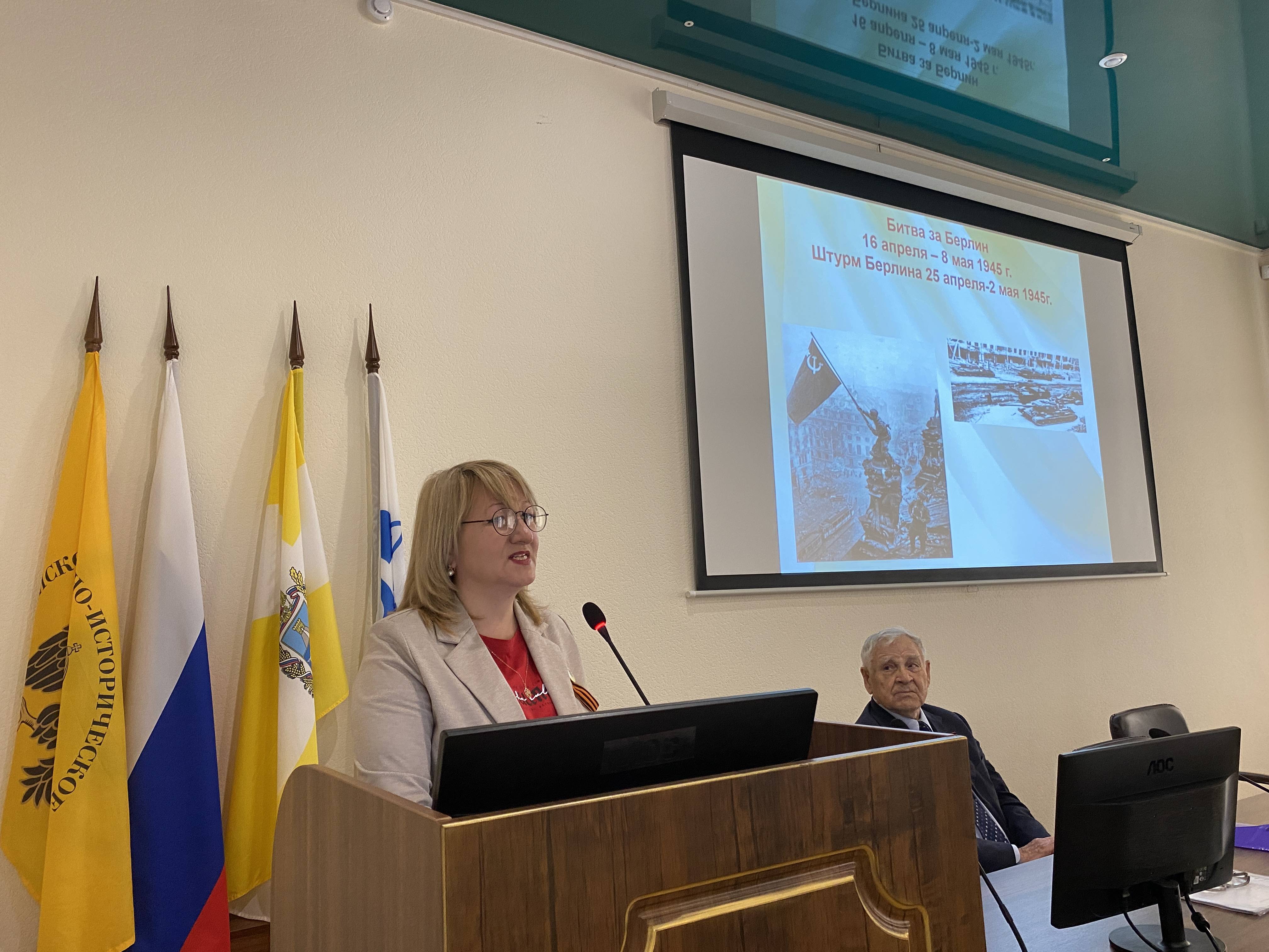 Стрекалова Е.Н. представила основные этапы битвы. Судавцов Н.Д. рассказал о ставропольцах – участниках Берлинской операции. Рассказ сопровождался демонстрацией тематических отрывков из документальных фильмов.