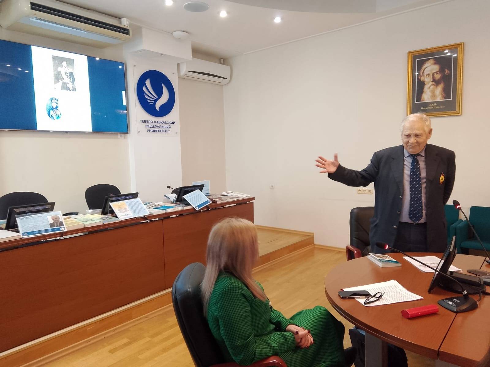 С приветственным словом к гостям обратился Зозуля И.В., к.и.н., к.ю.н., зам. директора научного департамента СКФУ, доцент кафедры истории России СКФУ, член РО РВИО СК. Гости мероприятия смогли пообщаться с Николаем Дмитриевичем и задать ему интересующие вопросы. Также в рамках презентации сотрудники Научной библиотеки СКФУ подготовили выставку трудов профессора, отражающую его неоценимый вклад в развитие отечественной исторической науки.