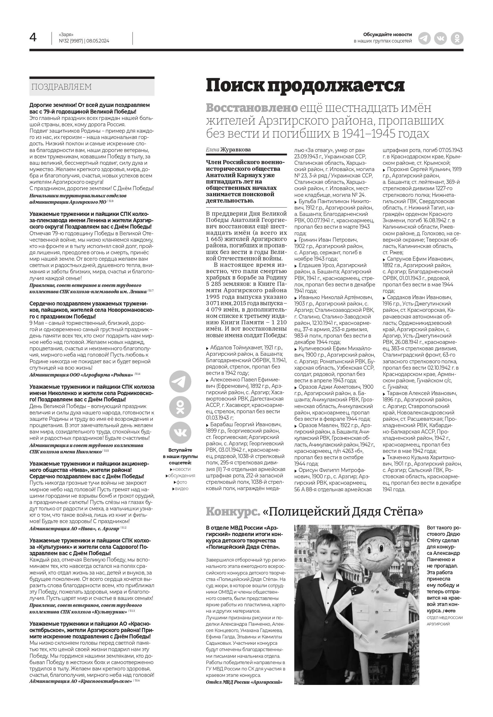 Накануне Дня Победы в газете "Заря" опубликована статья о поисковой деятельности А.Г. Карнауха, члена Местного отделения РО РВИО СК в Арзгирском муниципальном округе. На протяжении многих лет он восстанавливает имена и судьбы пропавших без вести в годы Великой Отечественной войны земляков. Благодаря ему еще 16 имен были возвращены из забвения. Популяризация этих данных в печати важна для того, чтобы внуки и правнуки поколения победителей знали и помнили наших Героев.