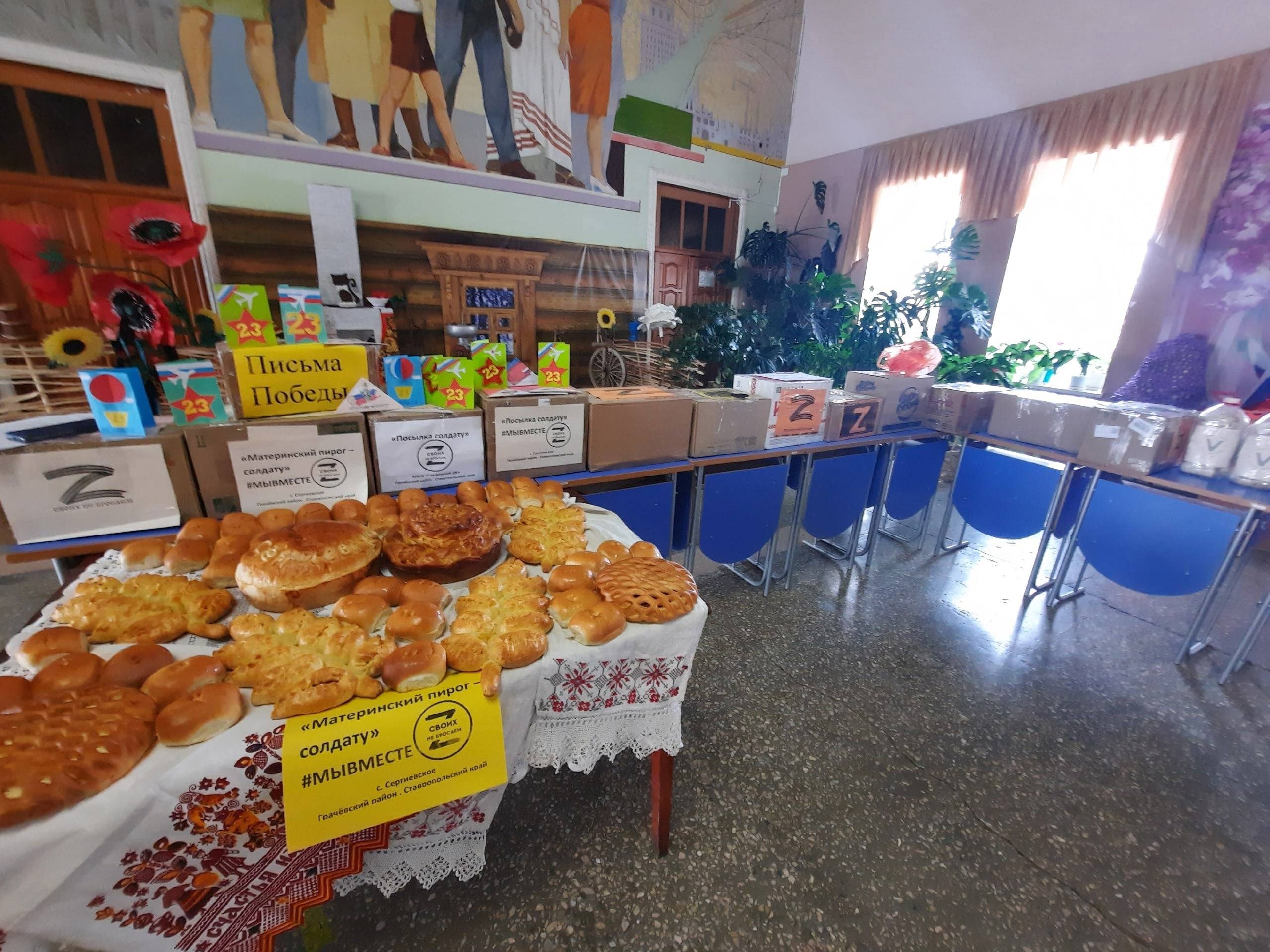 Активисты РО РВИО СК в с. Сергиевском собрали подарки, теплые вещи, письма. Жители села испекли домашние пироги, чтобы порадовать бойцов на передовой в честь Дня защитника Отечества.