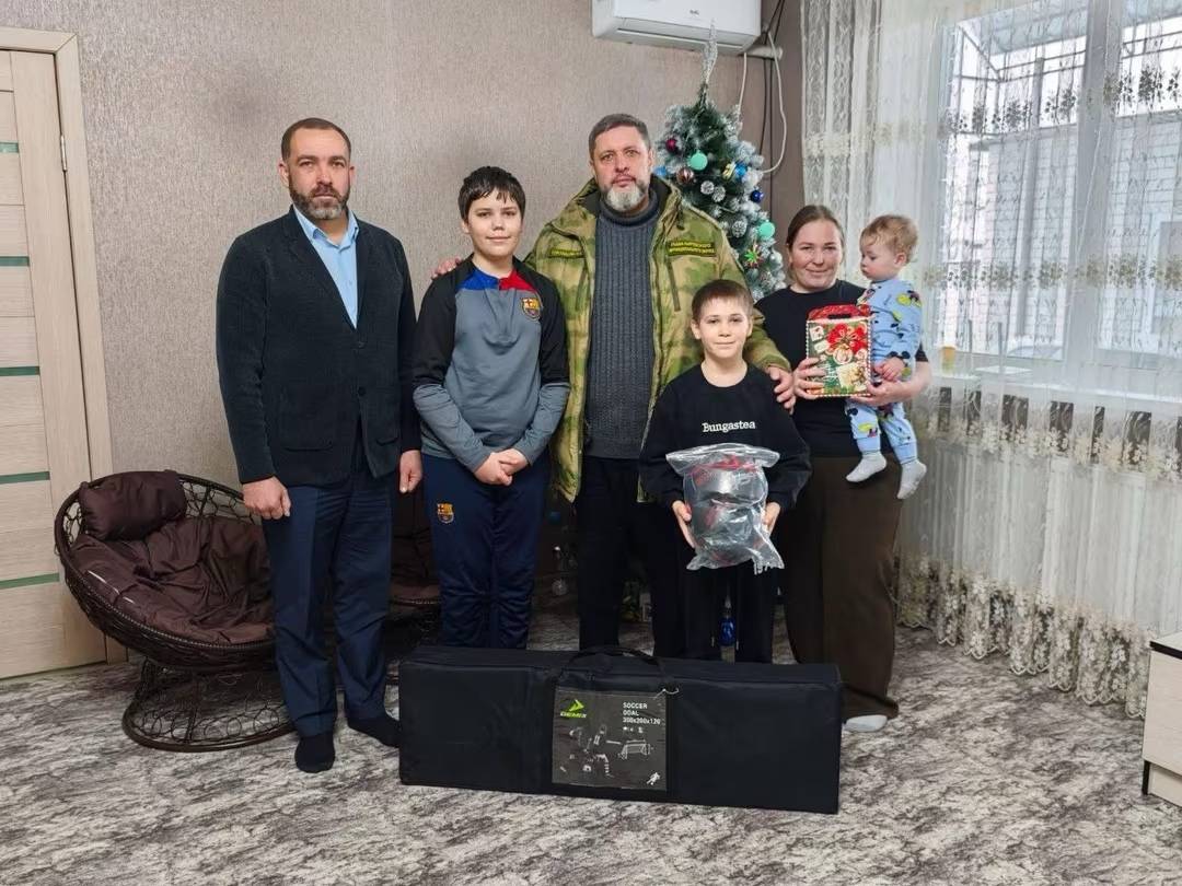 Глава Кировского округа Н.О. Новопашин, председатель Местного отделения РО РВИО СК в Кировском муниципальном округе, вручил подарки семье Мещеряковых. Три брата – Саша, Данила и Максим – всерьёз увлечены спортом. В этом году ребята загадали два подарка: футбольные ворота и спортивный шлем. Оба желания были оперативно исполнены.