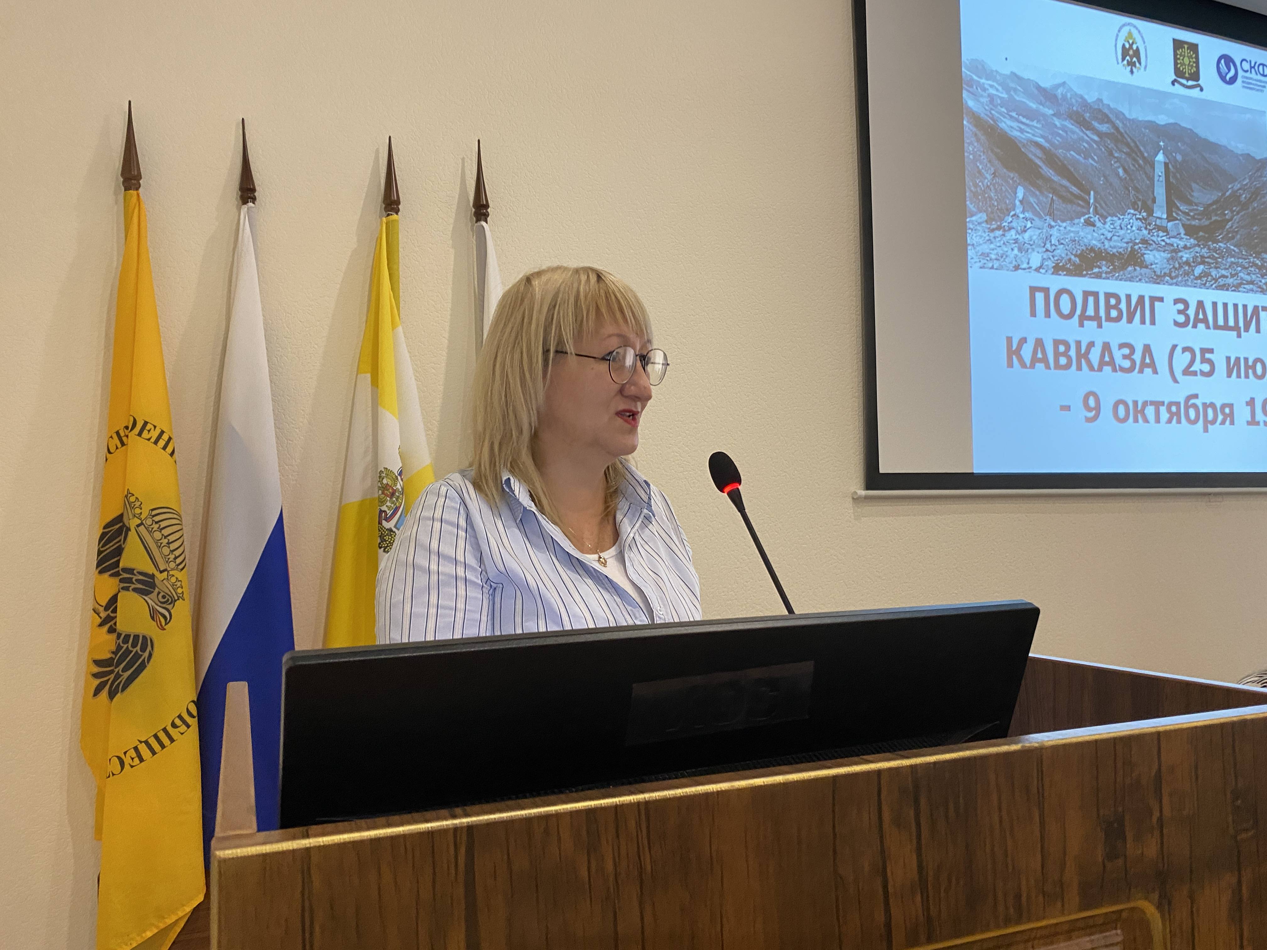 Стрекалова Е.Н., к.и.н., доцент кафедры истории России Северо-Кавказского федерального университета, старший научный сотрудник отдела военной истории и патриотической работы СГМЗ, член РО РВИО СК, рассказала о боях на перевалах Главного Кавказского хребта, о мемориалах, установленных в честь защитников Кавказа.