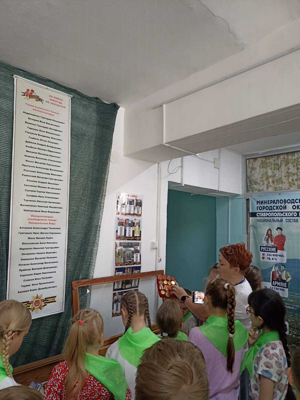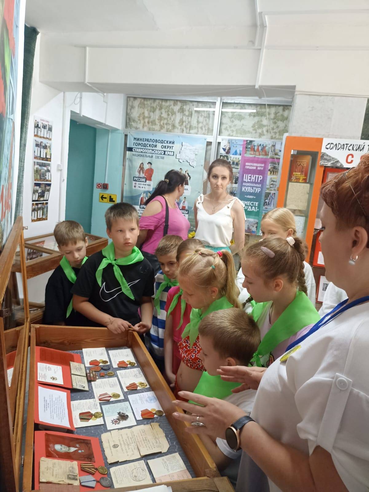 На прошлой неделе воспитанники пришкольного лагеря МБОУ гимназии №103 г. Минеральные Воды посетили Центральную городскую библиотеку им. Р.Н. Котовской. Экскурсию по музейной экспозиции «Помним. Гордимся. Чтим» провела заведующая отделом «Краеведение» Гаркуша Е.А., член Местного отделения Ставропольского регионального отделения Российского военно-исторического общества (РО РВИО СК) в Минераловодском муниципальном округе (председатель – Акопян М.Б.). Школьники узнали о событиях Великой Отечественной войны в родном городе, увидели фронтовые письма, награды, личные вещи бойцов и фрагменты снарядов. Завершилась встреча у стендов «Павшим героям посвящается», где ребята познакомились с историей мемориалов города и округа.