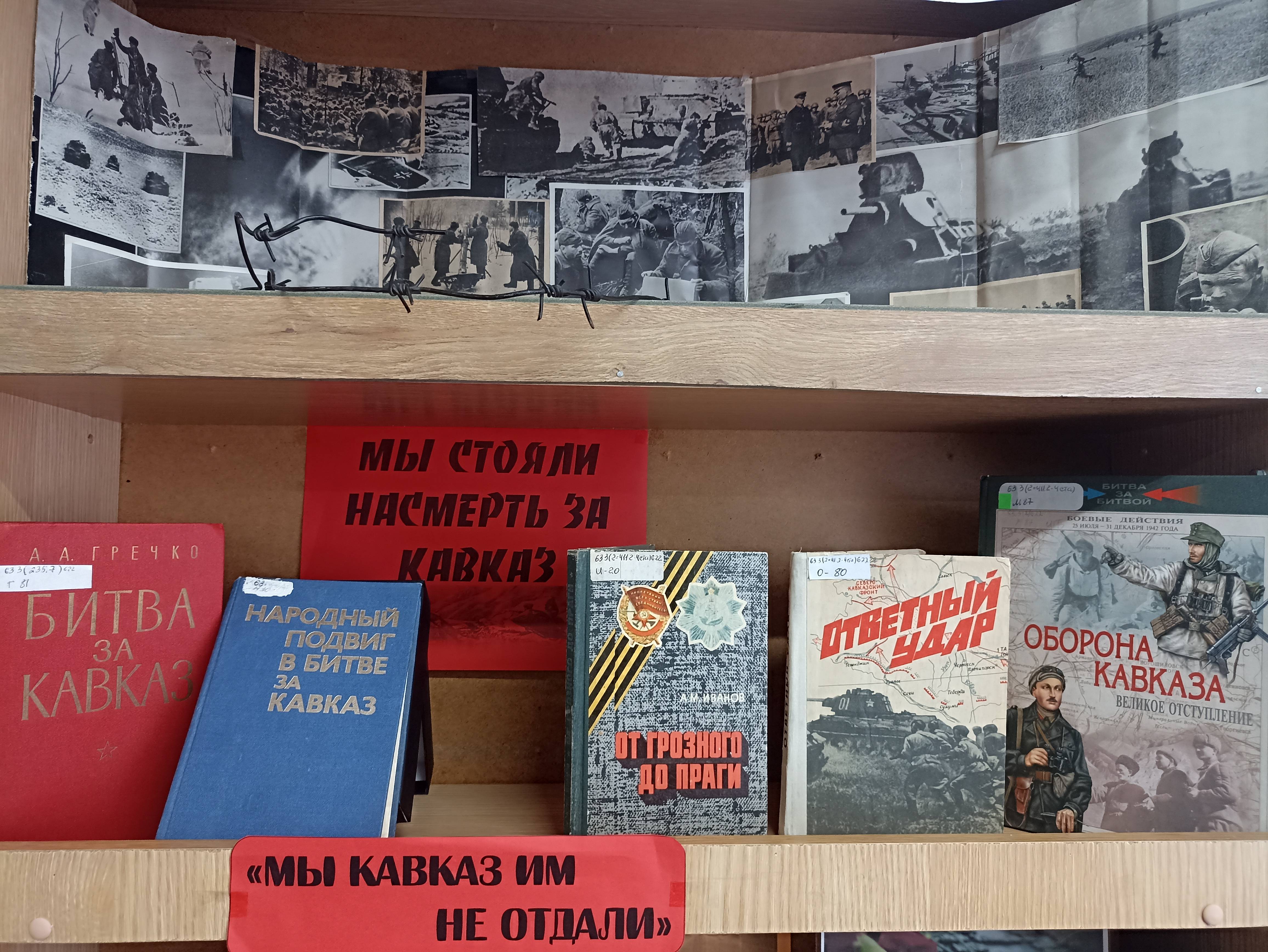 Также 25 июля отмечается день начала Битвы за Кавказ – одной из крупнейших оборонно-наступательных операций Великой Отечественной войны. Гаркуша Е.А., заведующий отделом Краеведения Центральной городской библиотеки им. Р.Н. Котовской, член Местного отделения РО РВИО СК в Минераловодском муниципальном округе (председатель – Акопян М.Б.) провела для читателей обзор книжной выставки «Мы будем помнить это», посвящённой 80-летию Победы в Великой Отечественной войне и Битве за Кавказ. На ней представлены книги ставропольских и минераловодских писателей, краеведов, историков, в которых описаны подвиги советского народа, в том числе минераловодских железнодорожников в годы войны, героизм защитников Кавказа – красноармейцев и офицеров при обороне Малгобека, на перевалах Кавказского хребта, чудовищные злодеяния фашистов во время оккупации Ставрополья. Читатели получили на память информационные выпуски и закладки об основных этапах Битвы за Кавказ и освобождении города Минеральные Воды.
