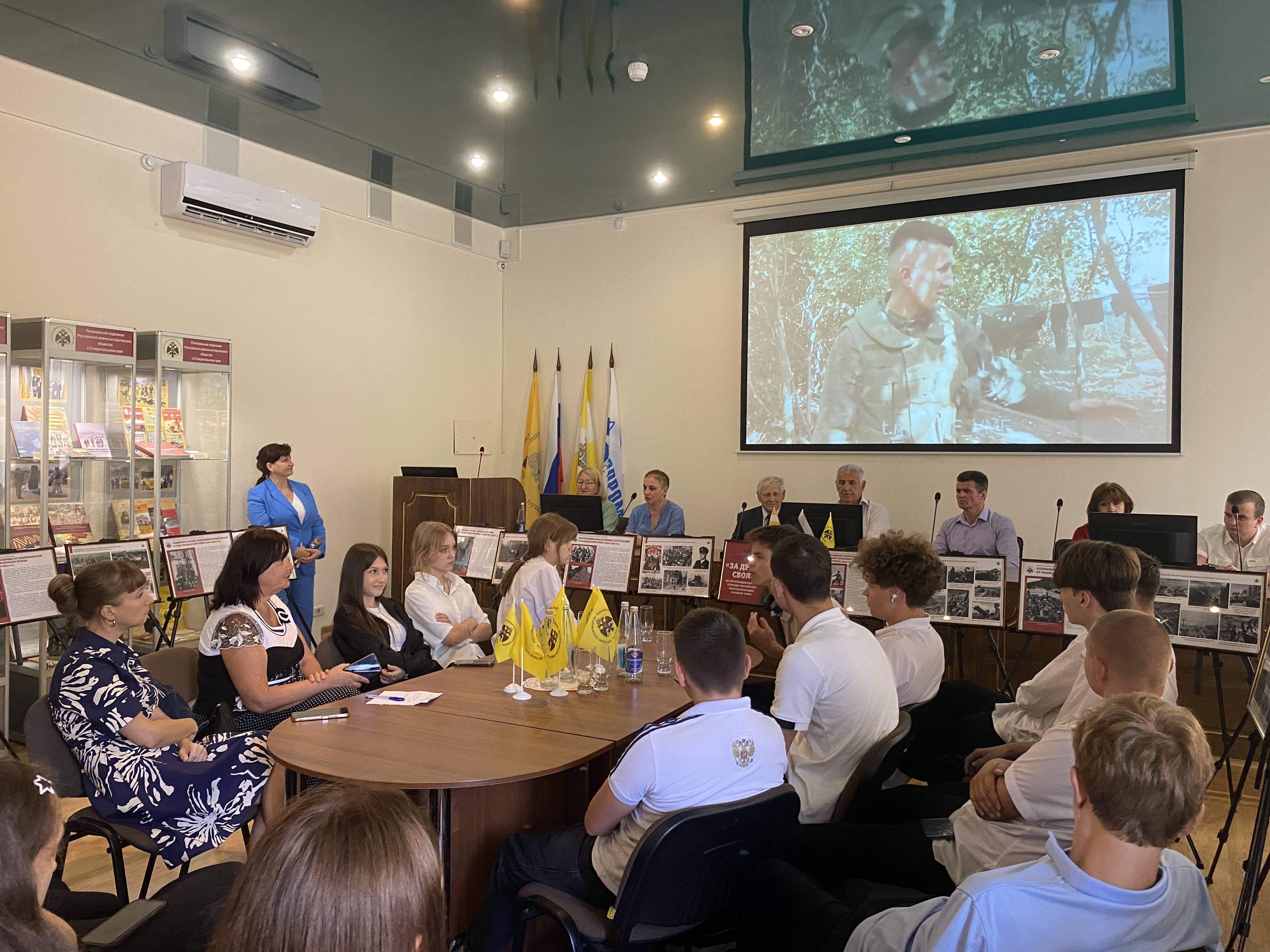 Каменева Г.Н. рассказала о той гуманитарной помощи, которую оказывает РО РВИО СК для наших бойцов. Школьникам продемонстрировали видеоответ, полученный с фронта от Р.М. Курбанова.