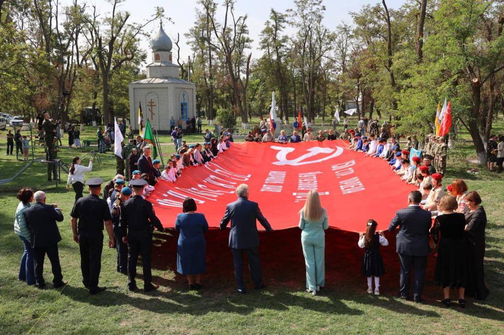 Участники митинга развернули увеличенную копию Знамя Победы, которую доставили участники краевого автопробега «Эх, путь-дорожка фронтовая».