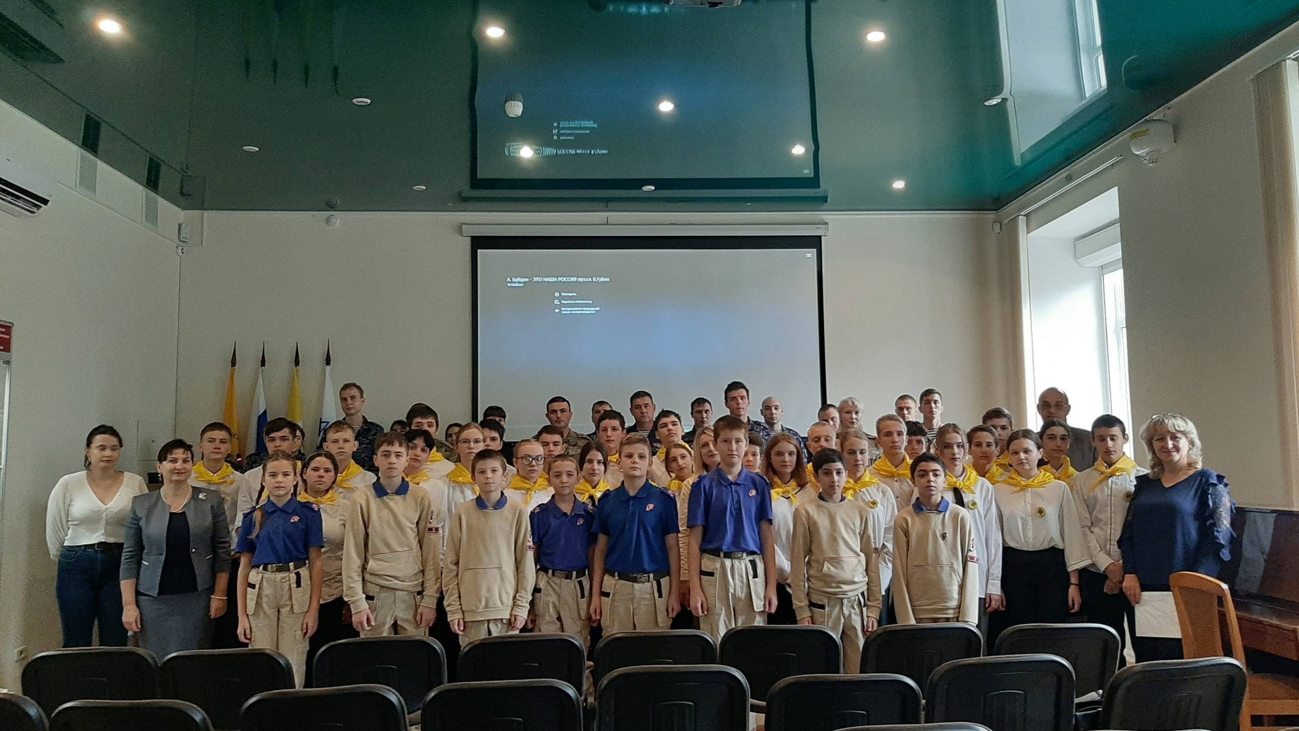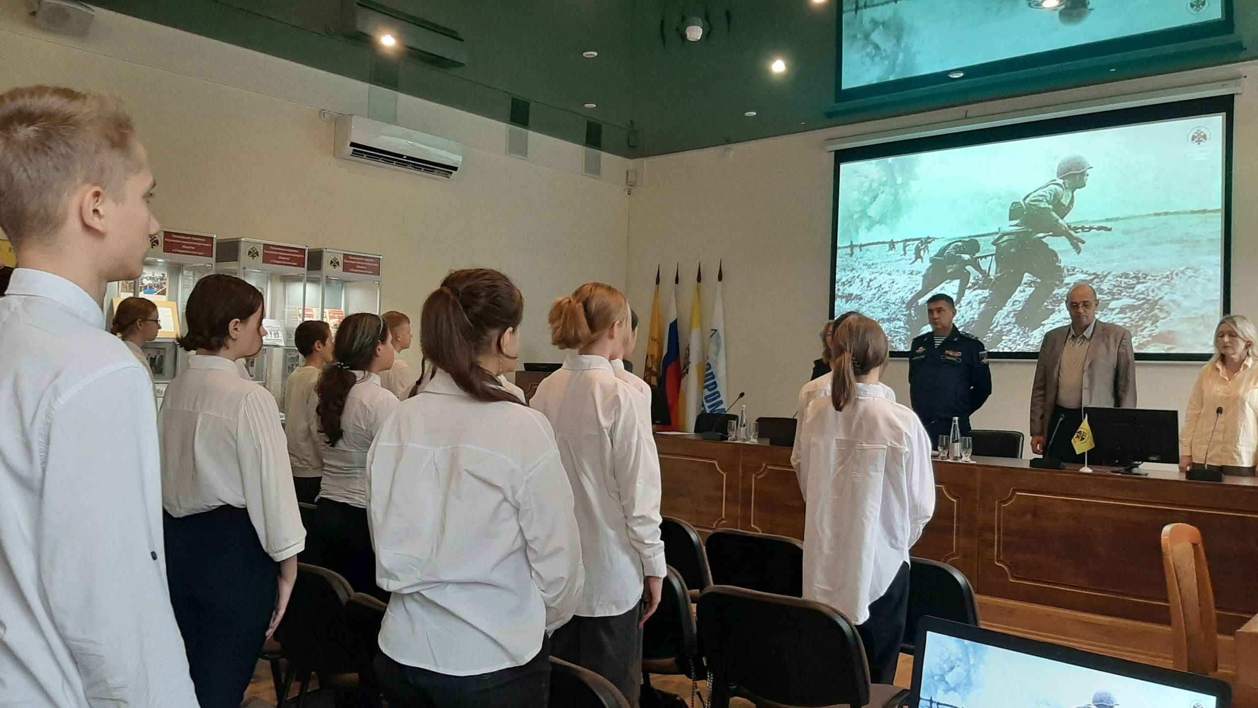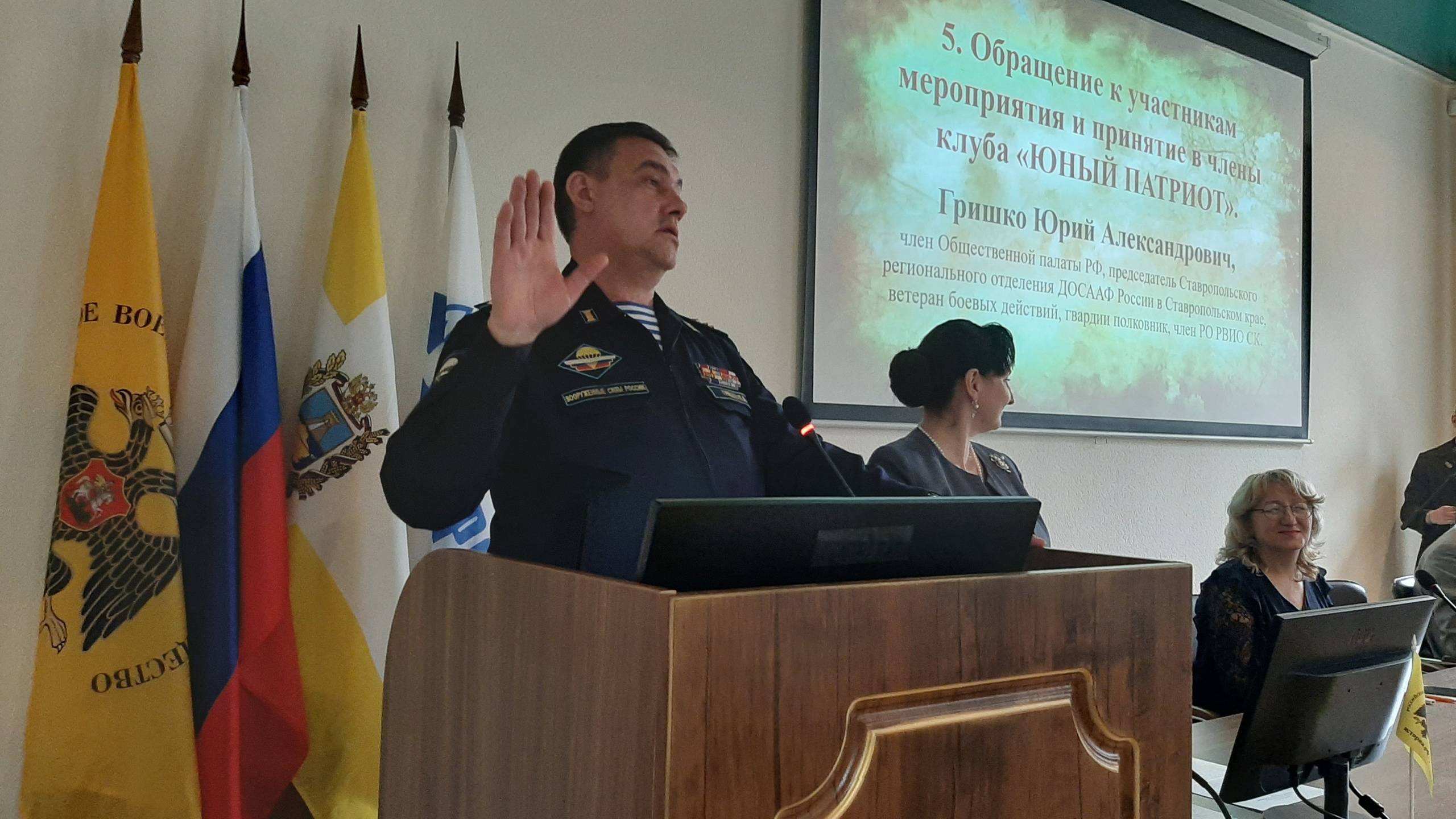Завершилось мероприятие торжественной церемонией вступления учащихся МБОУ СОШ №7 в члены клуба «Юный патриот» РО РВИО СК. Клятву ребята повторяли вслед за ветераном боевых действий, гвардии полковником, кавалером двух орденов Мужества – Ю.А. Гришко.