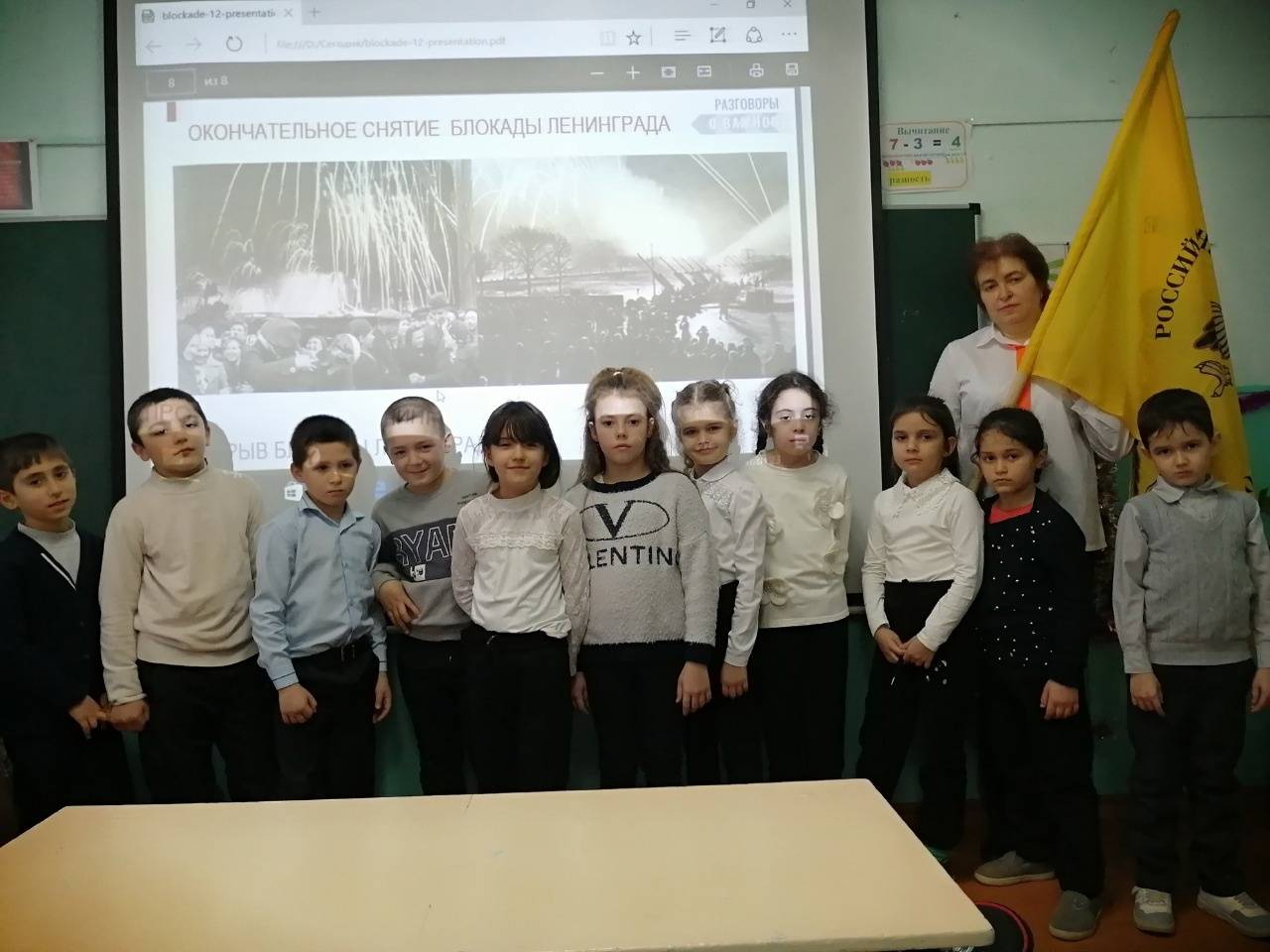 16 января 2023 года на базе МКОУ СОШ № 9 с. Родниковского члены Местного отделения Ставропольского регионального отделения Российского военно-исторического общества в с. Родниковском (председатель – Н.Н. Новак) в рамках курса внеурочной деятельности «Разговоры о важном» провели классные часы к 80-летию прорыва блокады Ленинграда.