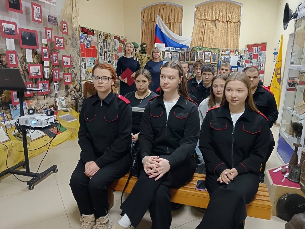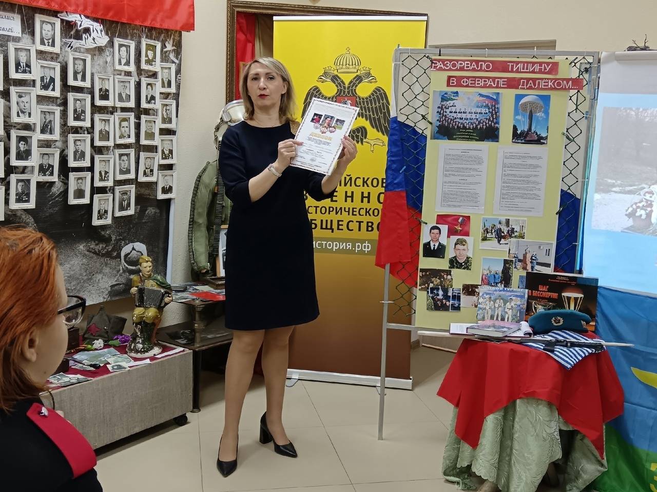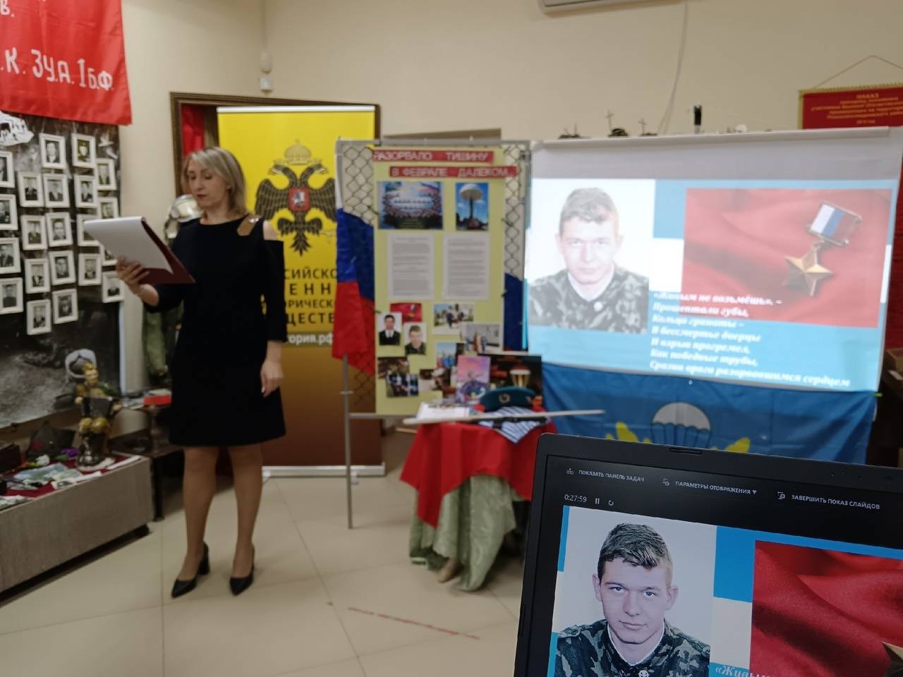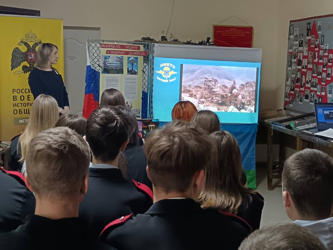Младший научный сотрудник музея Герасимова М.Ф., член Ставропольского регионального отделения Российского военно-исторического общества (РО РВИО СК), рассказала школьникам о ходе боя в Аргунском ущелье, о героизме гвардейцев-десантников и итогах сражения. Мероприятие сопровождалось показом тематической выставки «Разорвало тишину в феврале далёком…» и презентацией, в которой были представлены фотографии участников боя 29 февраля – 1 марта 2000 г., карта-схема боя, а также видеоклип песни о подвиге десантников 6-ой роты. Особое внимание было уделено рассказу о нашем земляке, Герое России В.А. Духине, который был одним из участников того памятного боя. Ребята узнали о детских и юношеских годах Владислава Духина, его характере и подвиге.
