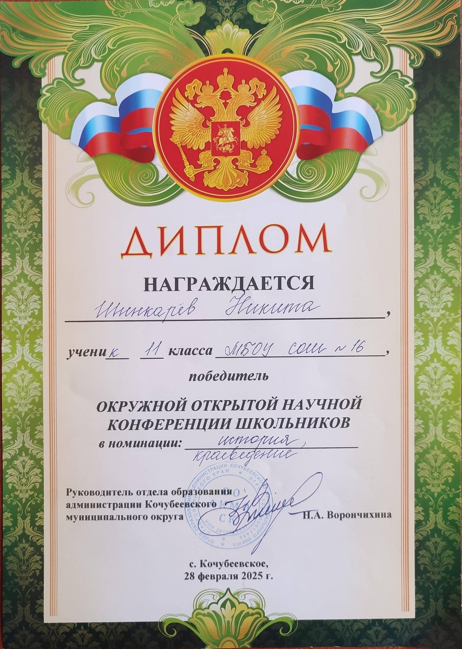 В номинации «История и краеведение» победителями и призерами стали краеведы Шинкарев Н. и Гарькавая О., член Местного отделения РО РВИО СК в Кочубеевском муниципальном округе. На конференции ими были представлены исследовательские работы о земляках, защищавших Отечество в годы Великой Отечественной войны - Н.Г. Шинкареве и Е.А. Лапко. Научным руководителем учащихся был Котов С.Н., учитель истории и краеведения, руководитель Центра музейной педагогики МБОУ СОШ №16 с. Казьминского, председатель Местного отделения РО РВИО СК в Кочубеевском муниципальном округе.
