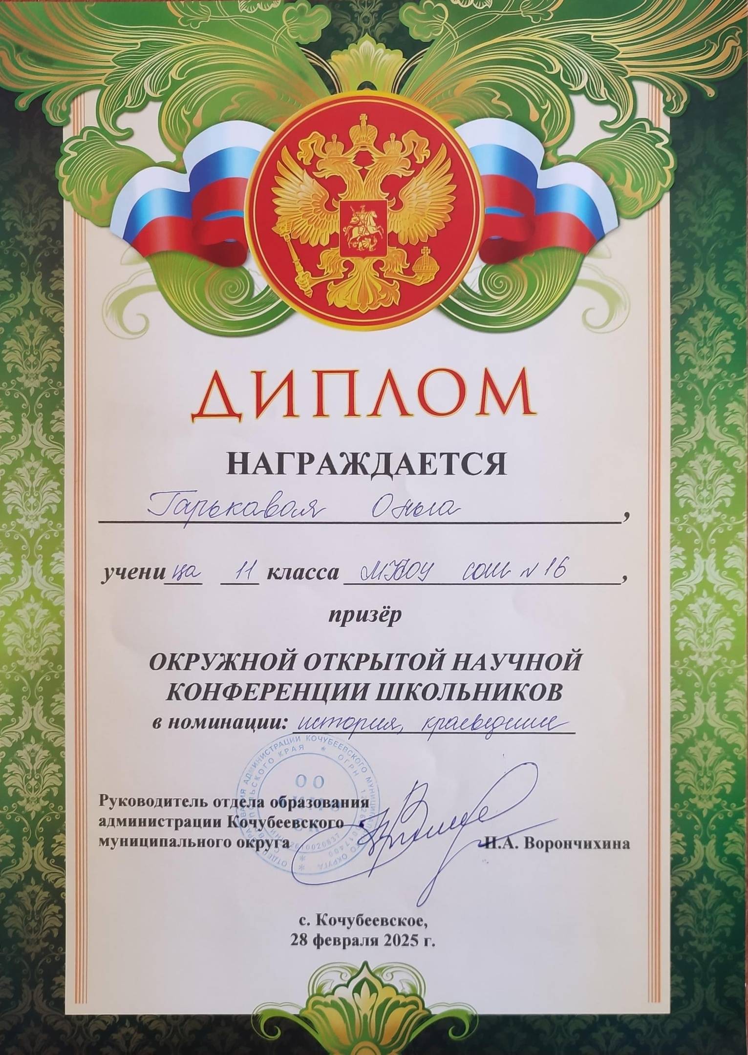 4 марта 2025 года в Доме детского творчества с. Кочубеевского состоялась муниципальная окружная открытая научная конференция школьников Малой академии наук. Активное участие в ней приняли учащиеся МБОУ СОШ №16 с. Казьминского (директор – Спиридонов А.В., член Местного отделения Ставропольского регионального отделения Российского военно-исторического общества (РО РВИО СК) в Кочубеевском муниципальном округе).