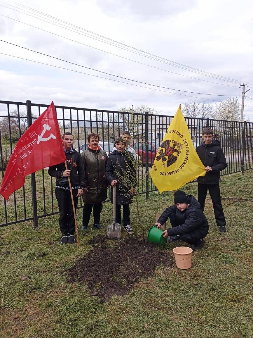 В тот же день учащиеся, педагоги и администрация МКОУ СОШ №7 ст. Беломечетской (директор – Волосовцева Е.А., член Местного отделения РО РВИО СК в Кочубеевском муниципальном округе (председатель – Котов С.Н.)) присоединились к ежегодной акции «Сад памяти». Целью этой масштабной инициативы является высадка 27 миллионов деревьев в память о погибших в годы Великой Отечественной войны. В этом году акция имеет особое значение – она приурочена к 80-летию Победы в Великой Отечественной войне и Году защитника Отечества. На территории школы были высажены 22 саженца ели, березы и катальпы. Теперь молодые деревья не только украсят школьный двор, но и станут символом благодарности и памяти.