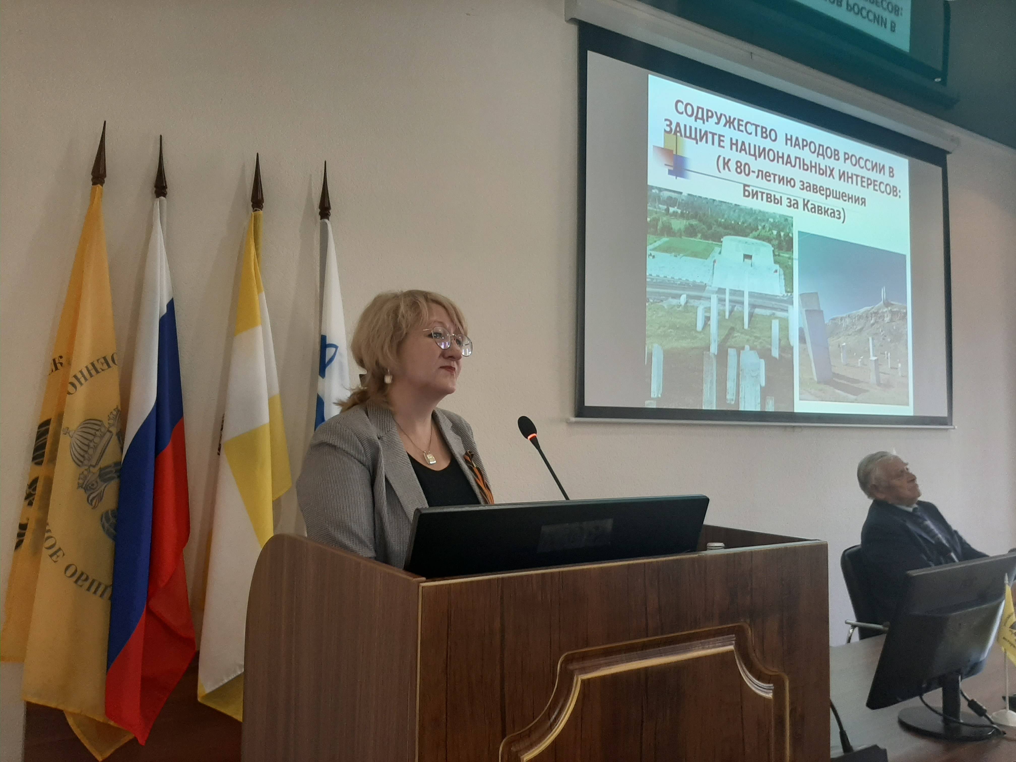 Эксперты рассказали о том, что в достижении победы в Великой Отечественной войне важнейшую роль сыграло социальное и политическое сплочение народов СССР. Перед лицом угрозы порабощения и физического уничтожения немецко-фашистскими захватчиками многочисленные народы и народности СССР, по сути, стали единым народом. Стрекалова Е.Н. рассказала о Битве за Кавказ, о национальных формированиях, принимающих участие в битве, о народах Кавказа, которые самоотверженно и бесстрашно защищали кавказские перевалы. Судавцов Н.Д. представил собравшимся национальный состав Героев Советского Союза, подробнее рассказав о Героях Советского Союза: русском А.И. Покрышкине, эстонце И.И. Лааре, армянине Н.Г. Степаняне, осетине И.А. Плиеве и других.