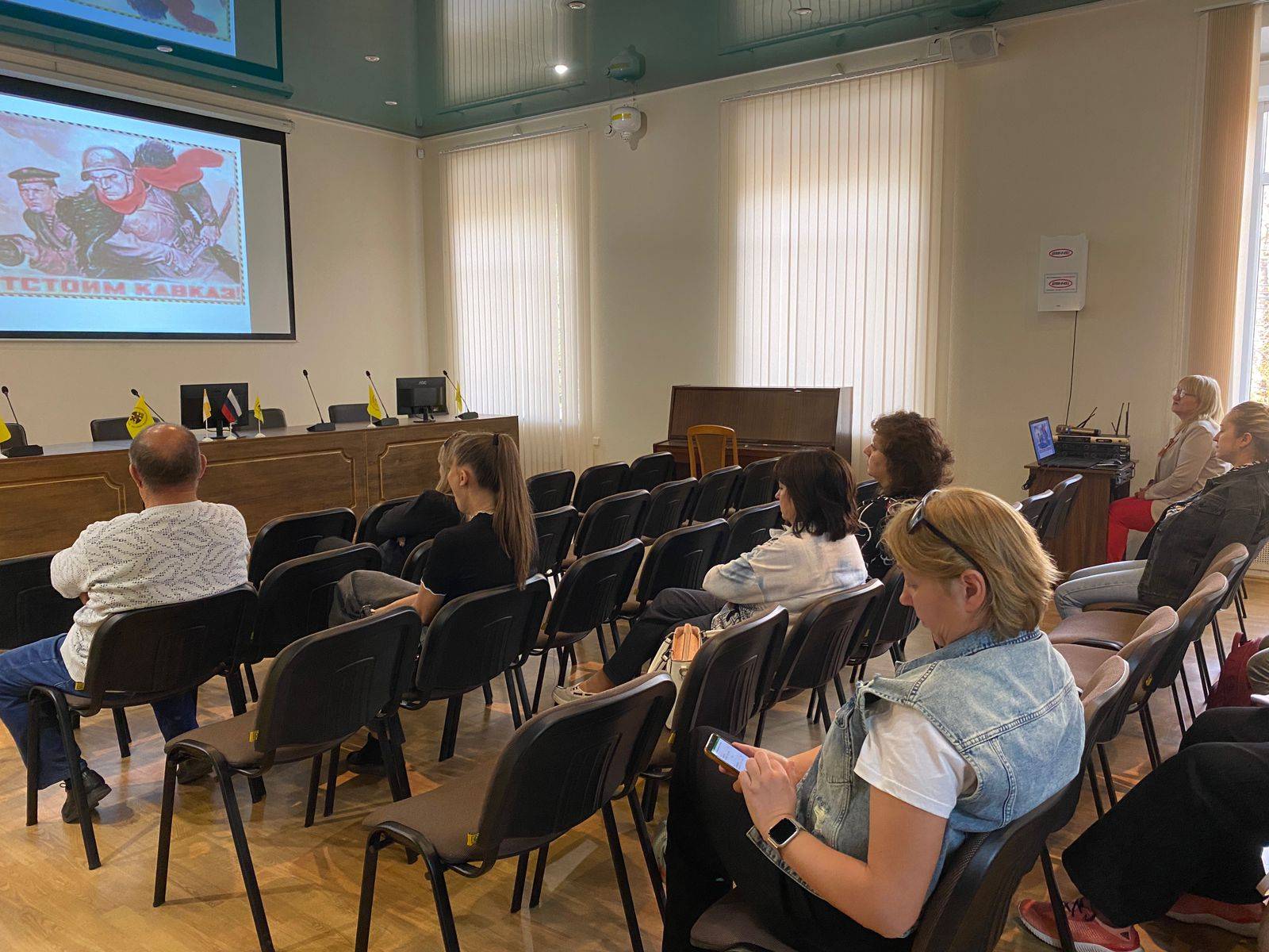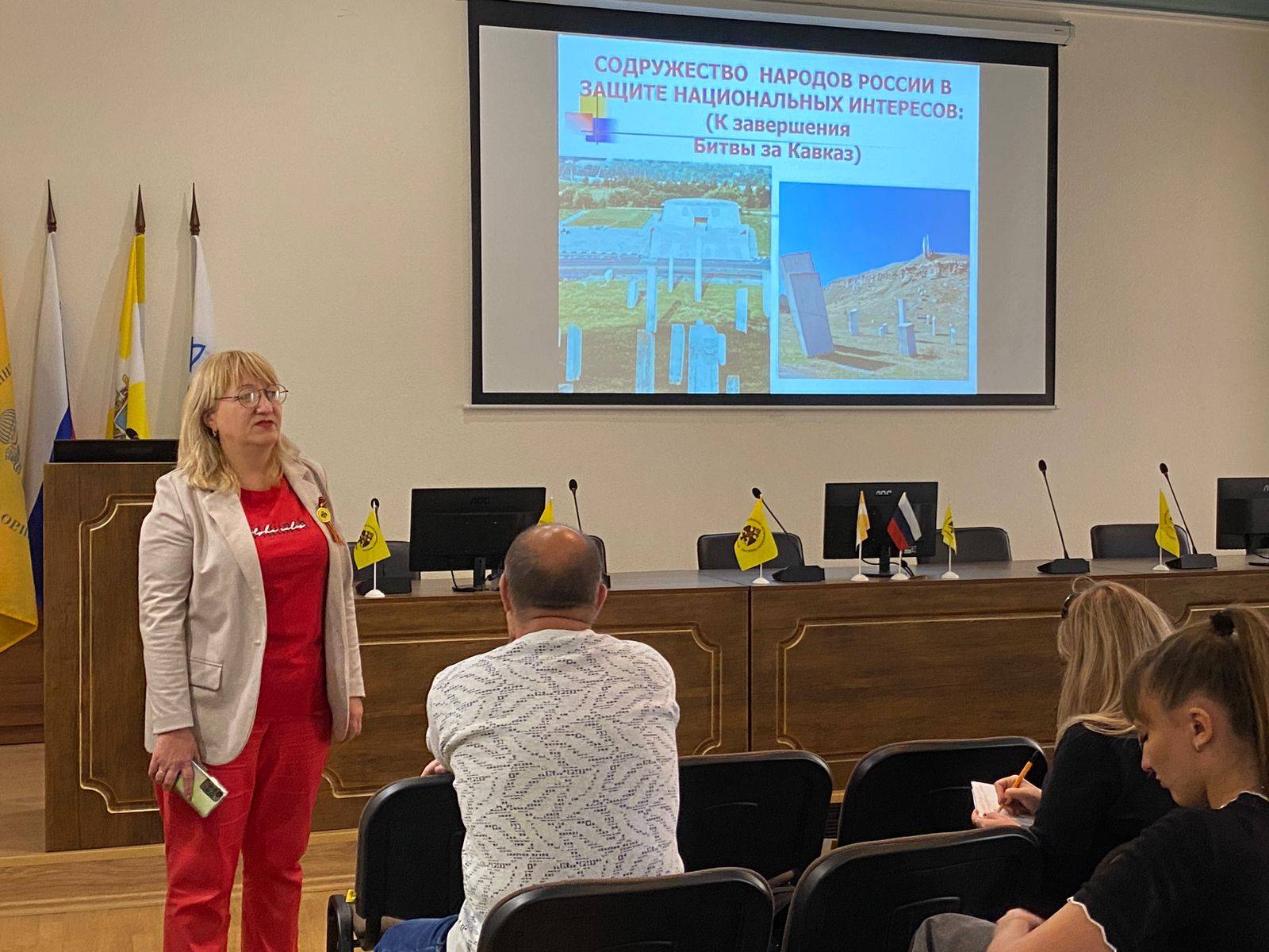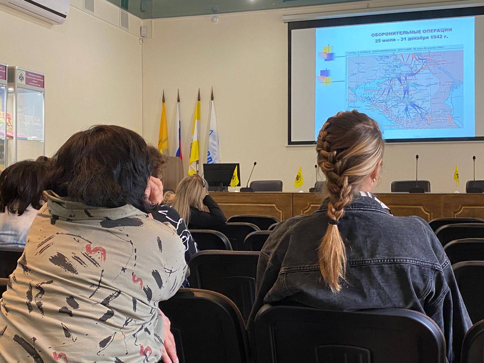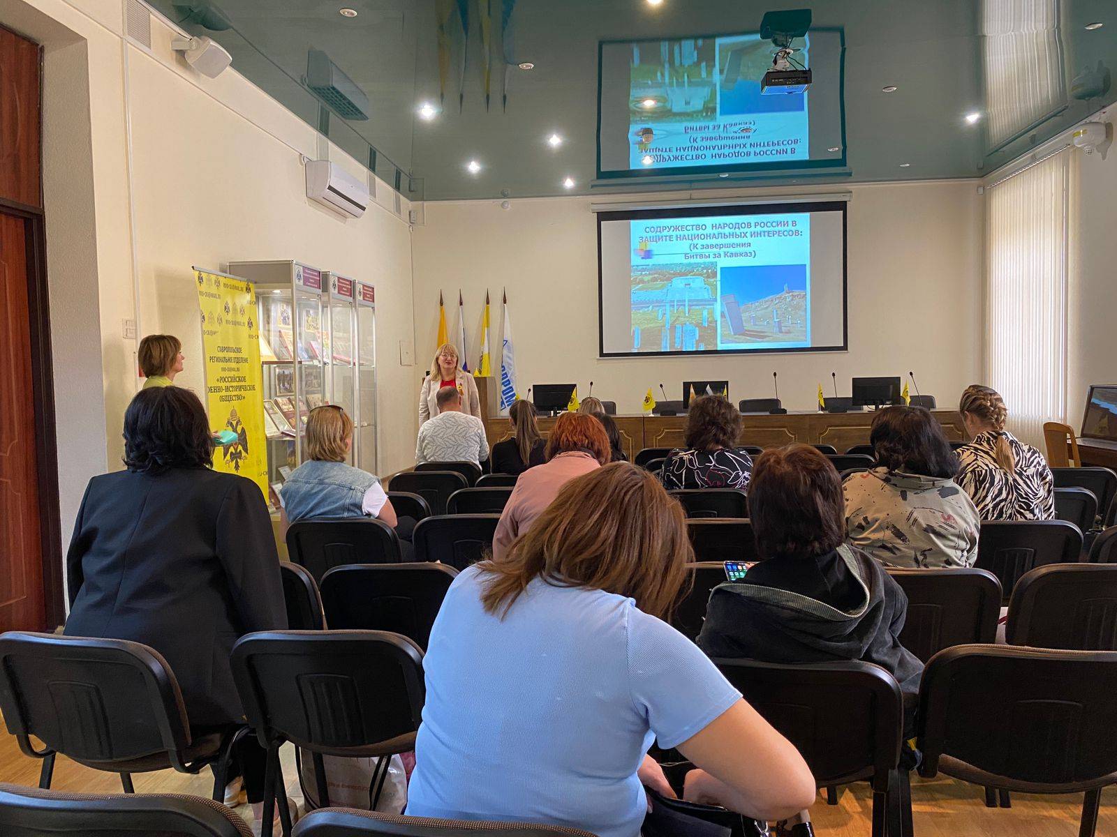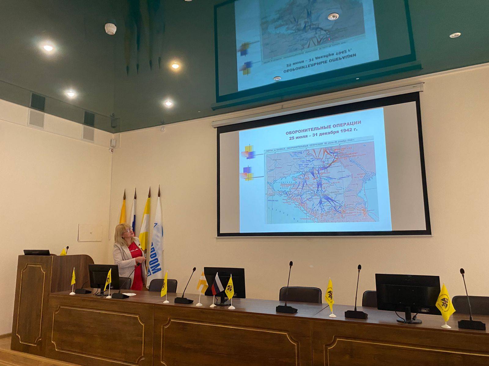 Лектор Стрекалова Е.Н., к.и.н., доцент кафедры истории России Северо-Кавказского федерального университета, старший научный сотрудник отдела военной истории и патриотической работы СГМЗ, член РО РВИО СК, в своем выступлении рассказала о значимости Битвы за Кавказ в ходе Великой Отечественной войны, об оккупации и освобождении Ставропольского края, о ставропольцах – участниках Битвы за Кавказ, о вкладе многонационального народа Кавказа в достижение общей Победы.