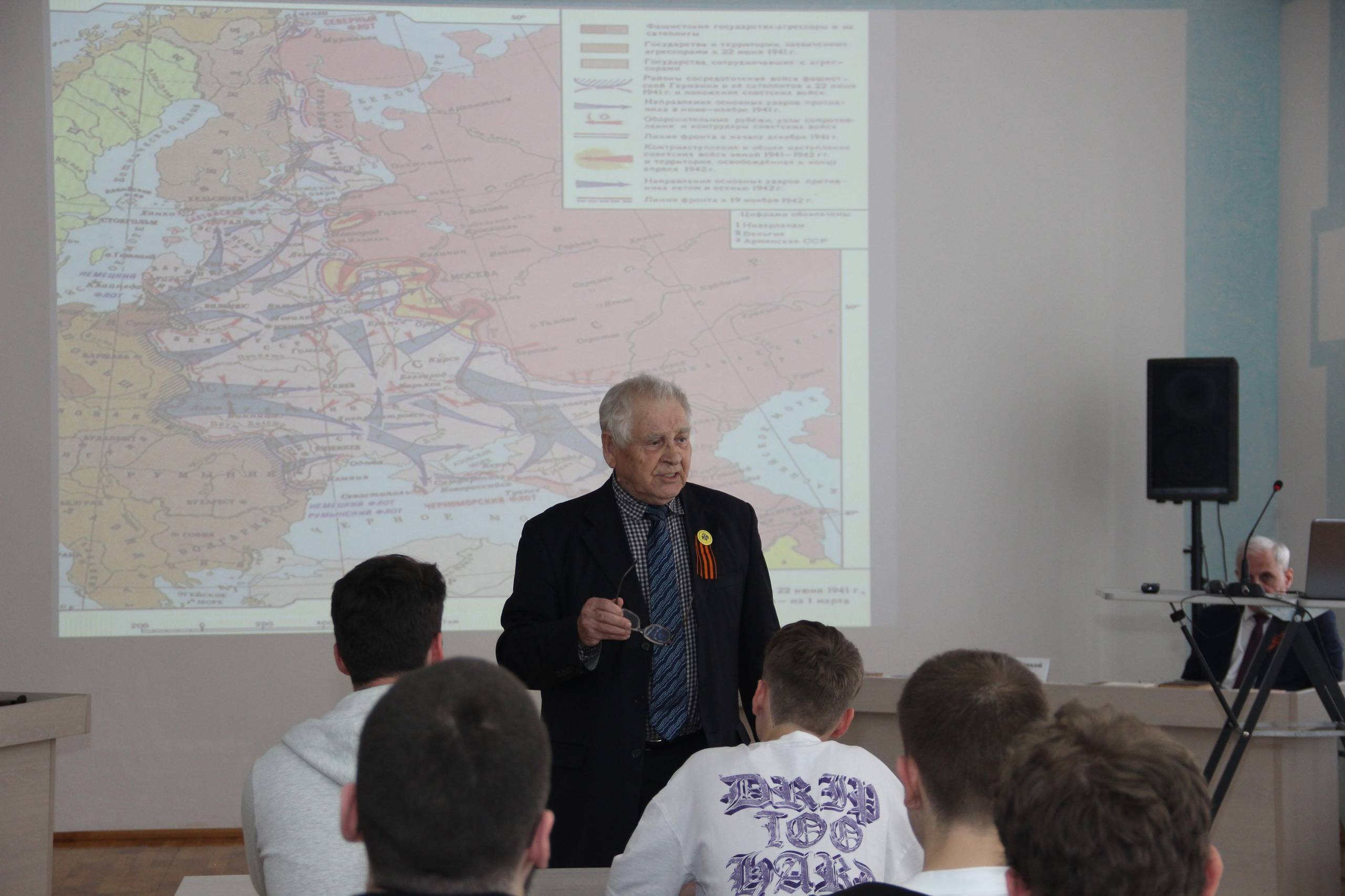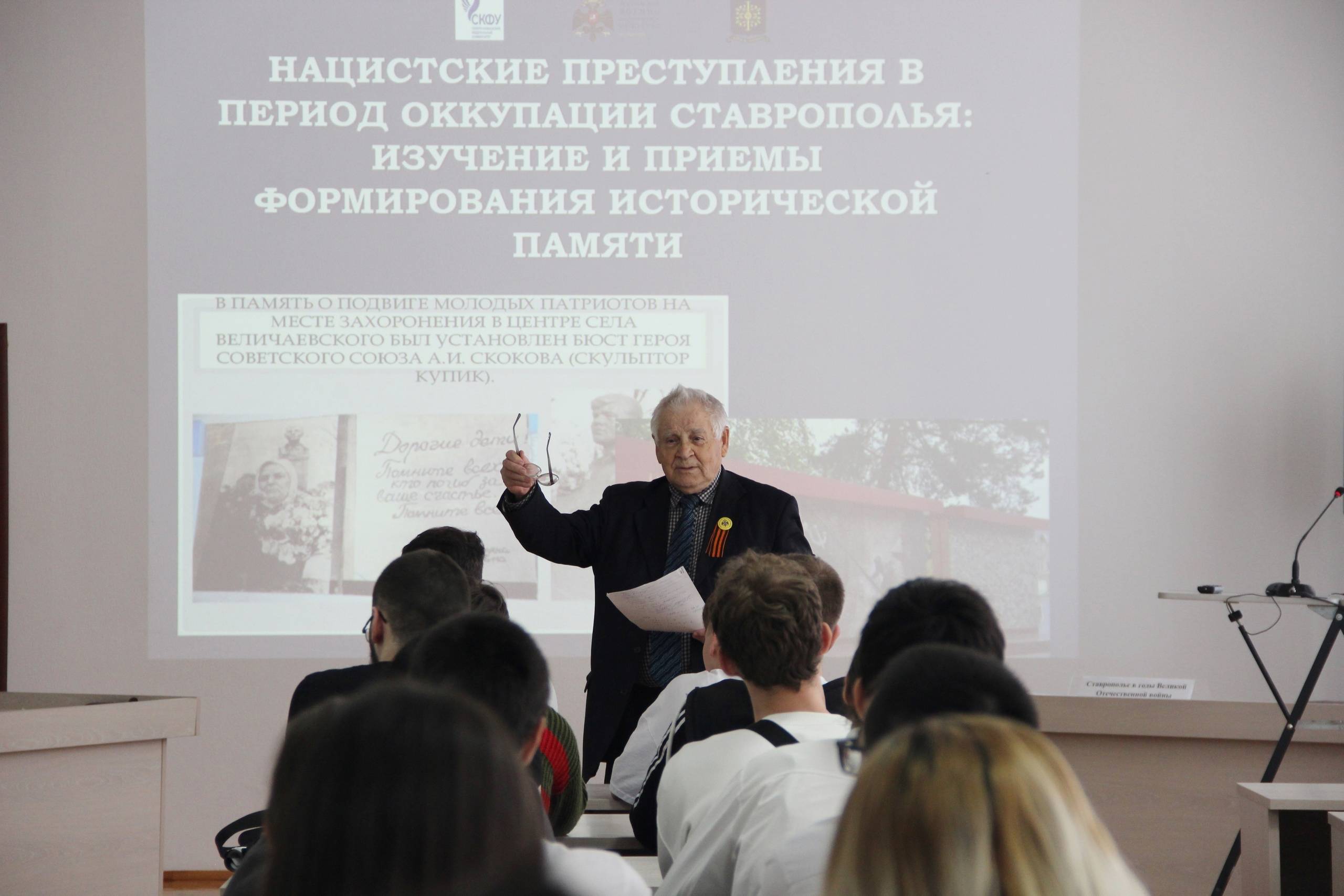Судавцов Н.Д., д.и.н., Почетный профессор СКФУ, главный научный сотрудник отдела военной истории и патриотической работы Ставропольского государственного музея-заповедника (СГМЗ), один из учредителей РО РВИО СК в своем докладе поднял вопросы о роли Битвы за Кавказ в истории Великой Отечественной войны, о боях, развернувшихся на территории Ставропольского края, о преступлениях нацистов на оккупированной территории.