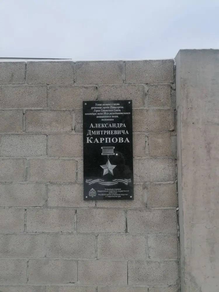 В с. Золотушка Пятигорского городского округа состоялось открытие памятной доски в честь Героя Советского Союза, уроженца г. Пятигорска Карпова А.Д., полковника, командира звена 30-го разведывательного авиационного полка. Новый мемориальный объект был установлен на улице, носящей имя Героя, по инициативе Регионального отделения Российского военно-исторического общества в Ставропольском крае (РО РВИО СК) в рамках реализации проекта «Историческая память поколений» при поддержке Министерства молодёжной политики Ставропольского края.
