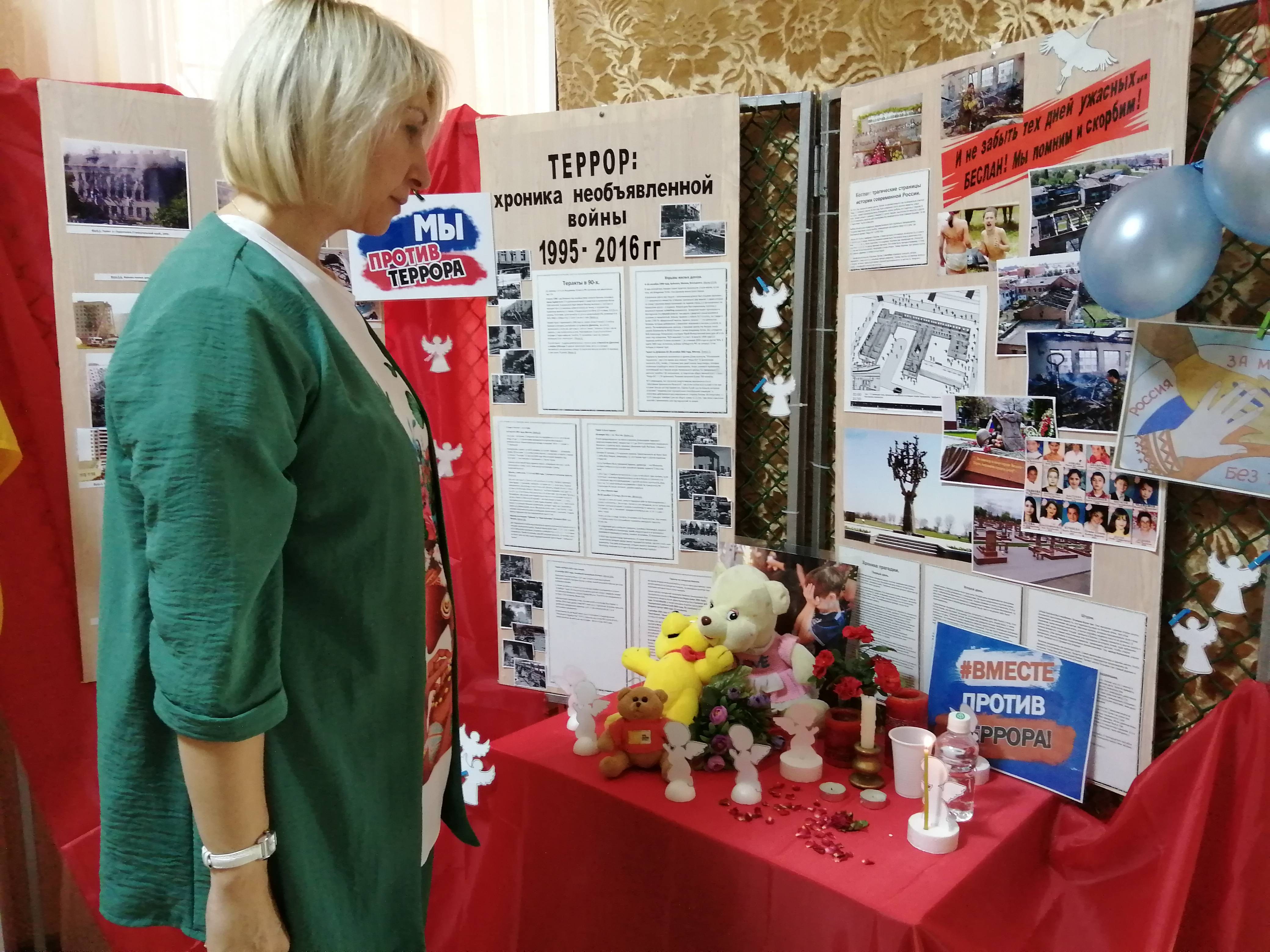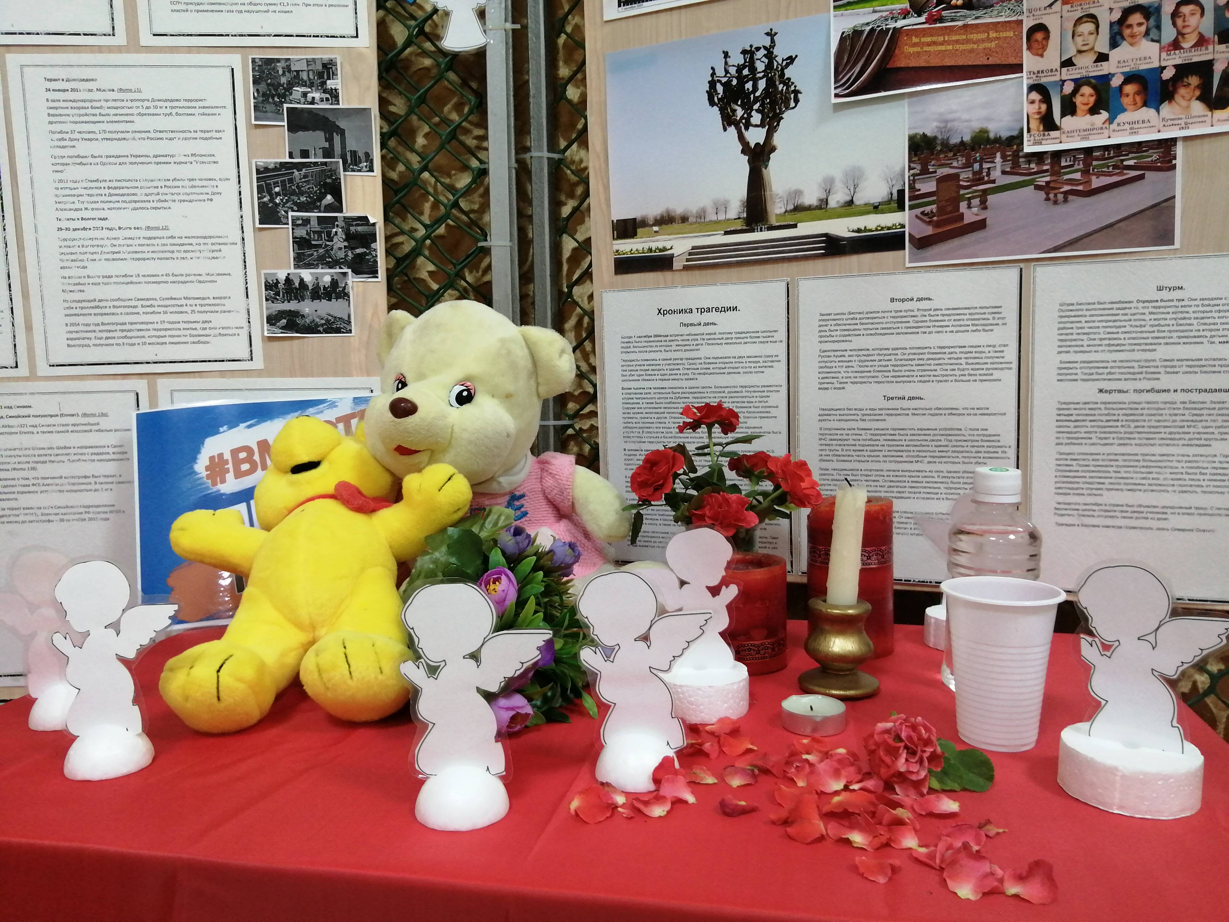 Была проведена экскурсию по музейной экспозиции «Цветы и крест в ладошке детской», которая содержит фотографии с места теракта, участников событий.