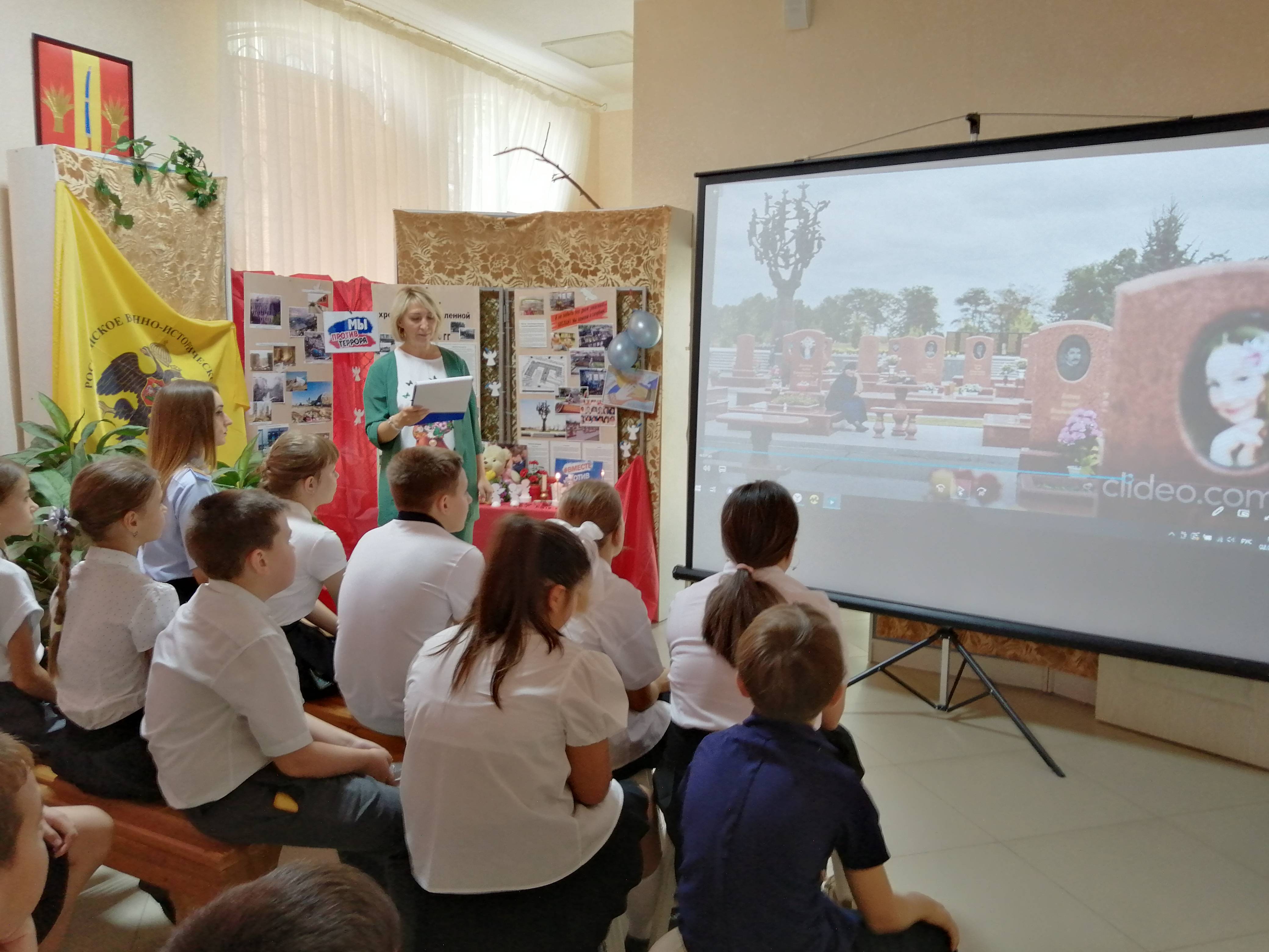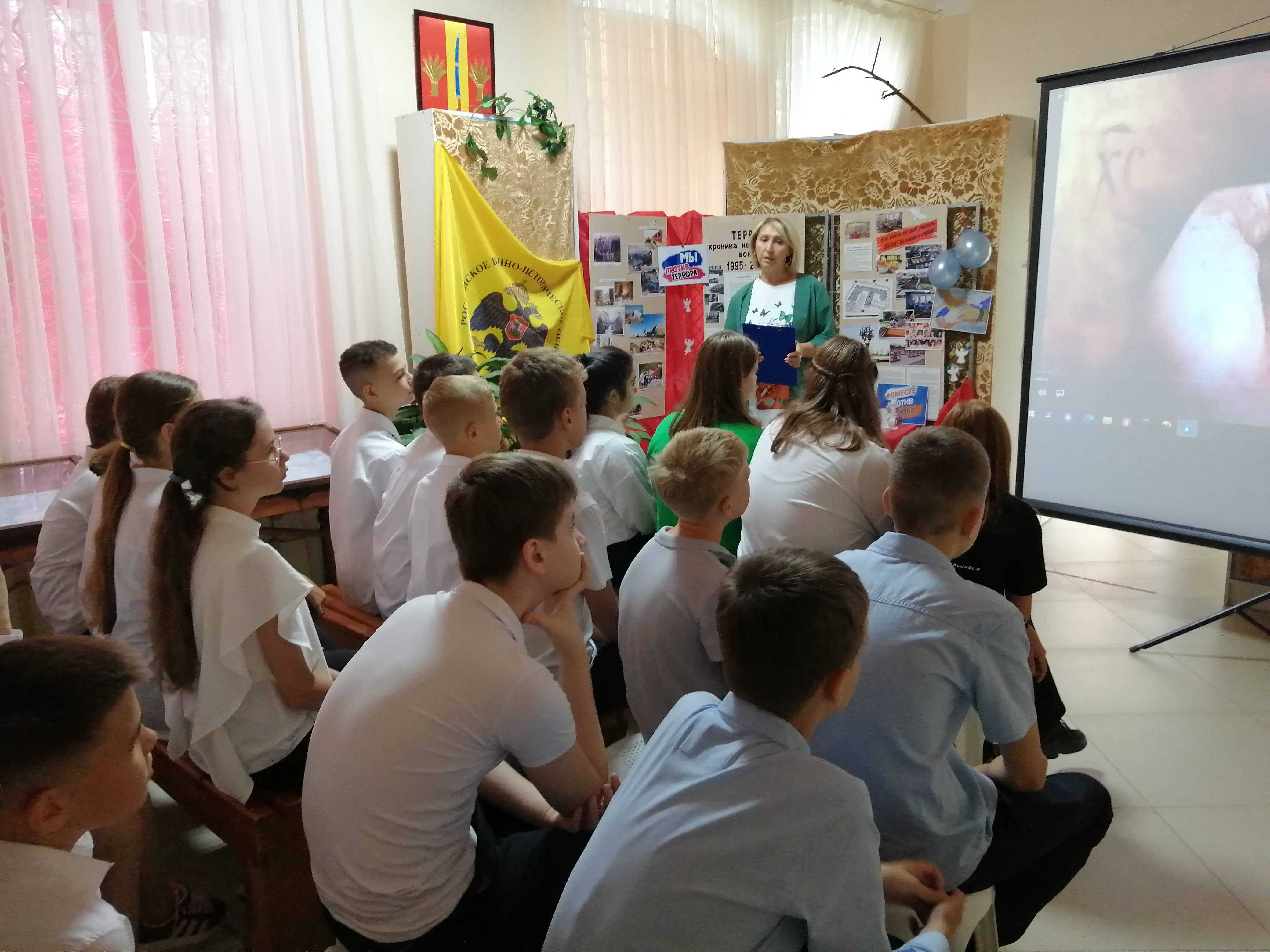 Герасимова М.Ф. и Скрипникова Л.А. раскрыли школьникам хронологию событий 2004 года, продемонстрировали новостные сюжеты того периода, рассказали о погибших в результате теракта и судьбах выживших.