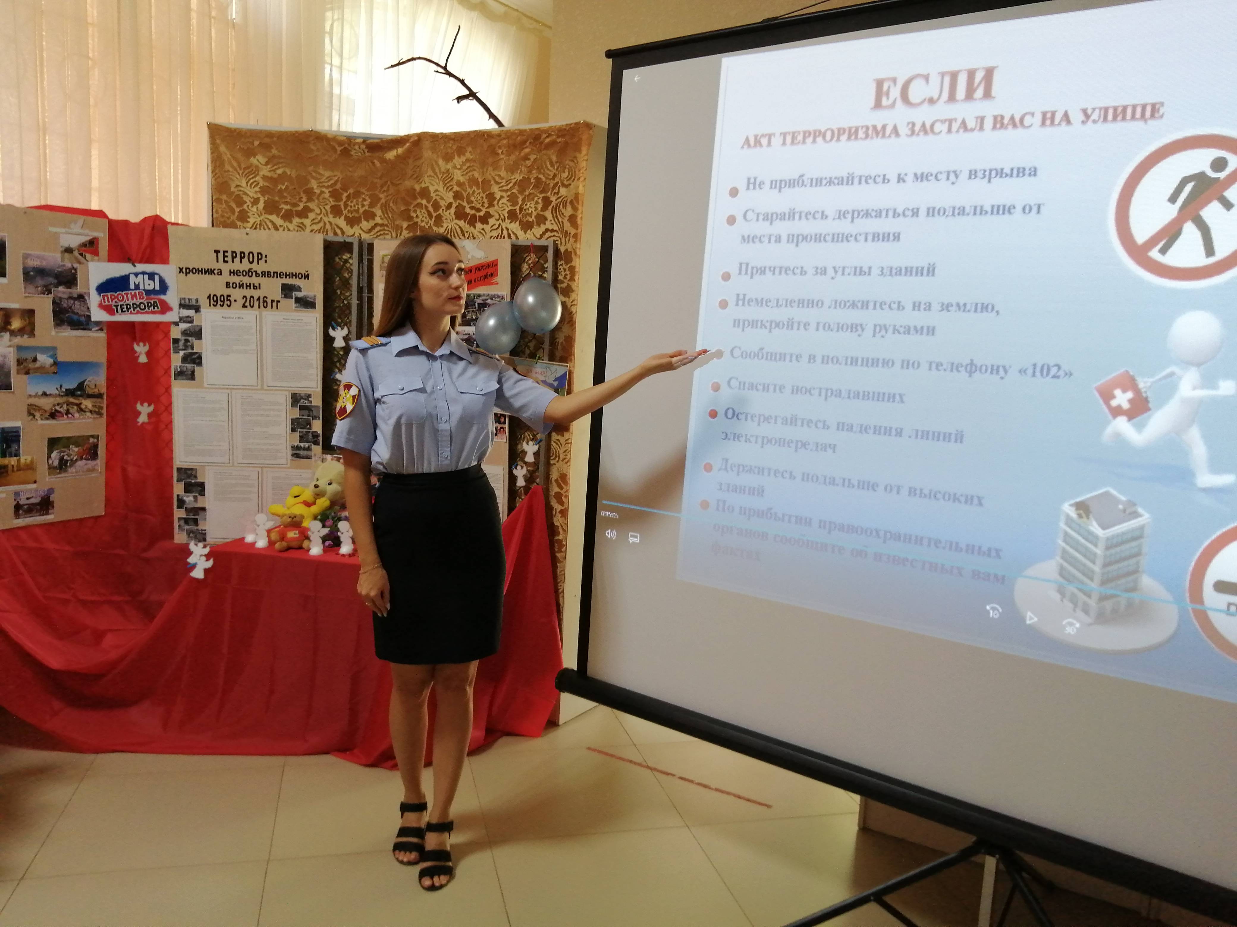 Сотрудник МОВО по НГО филиала ФГКУ «УВО ВНГ России по Ставропольскому краю», сержант полиции Юрина А.А. познакомила детей с правилами поведения в общественных местах, рассказала, как можно предотвратить теракт, как вести себя при возможном теракте, чтобы сохранить свою жизнь.