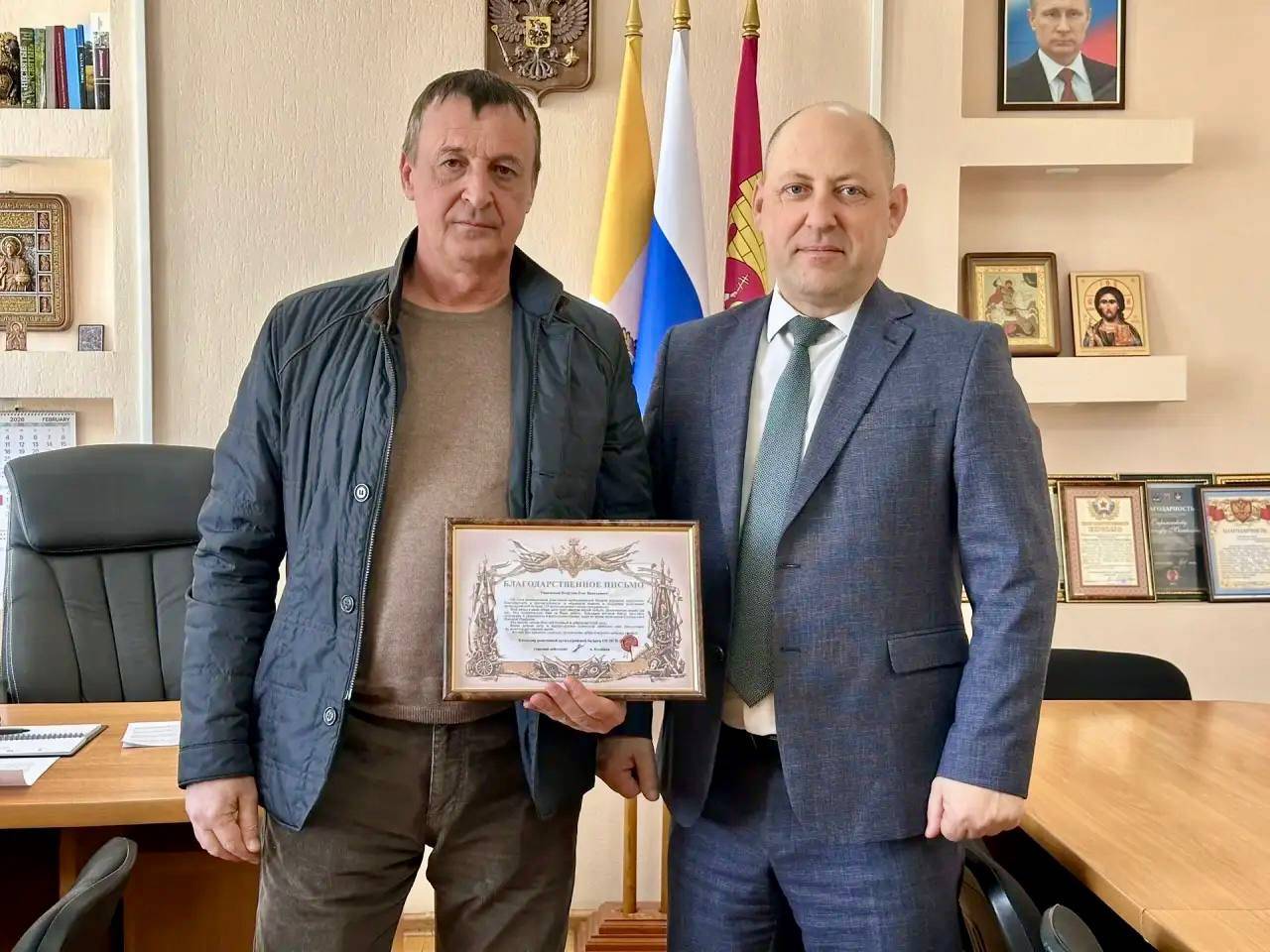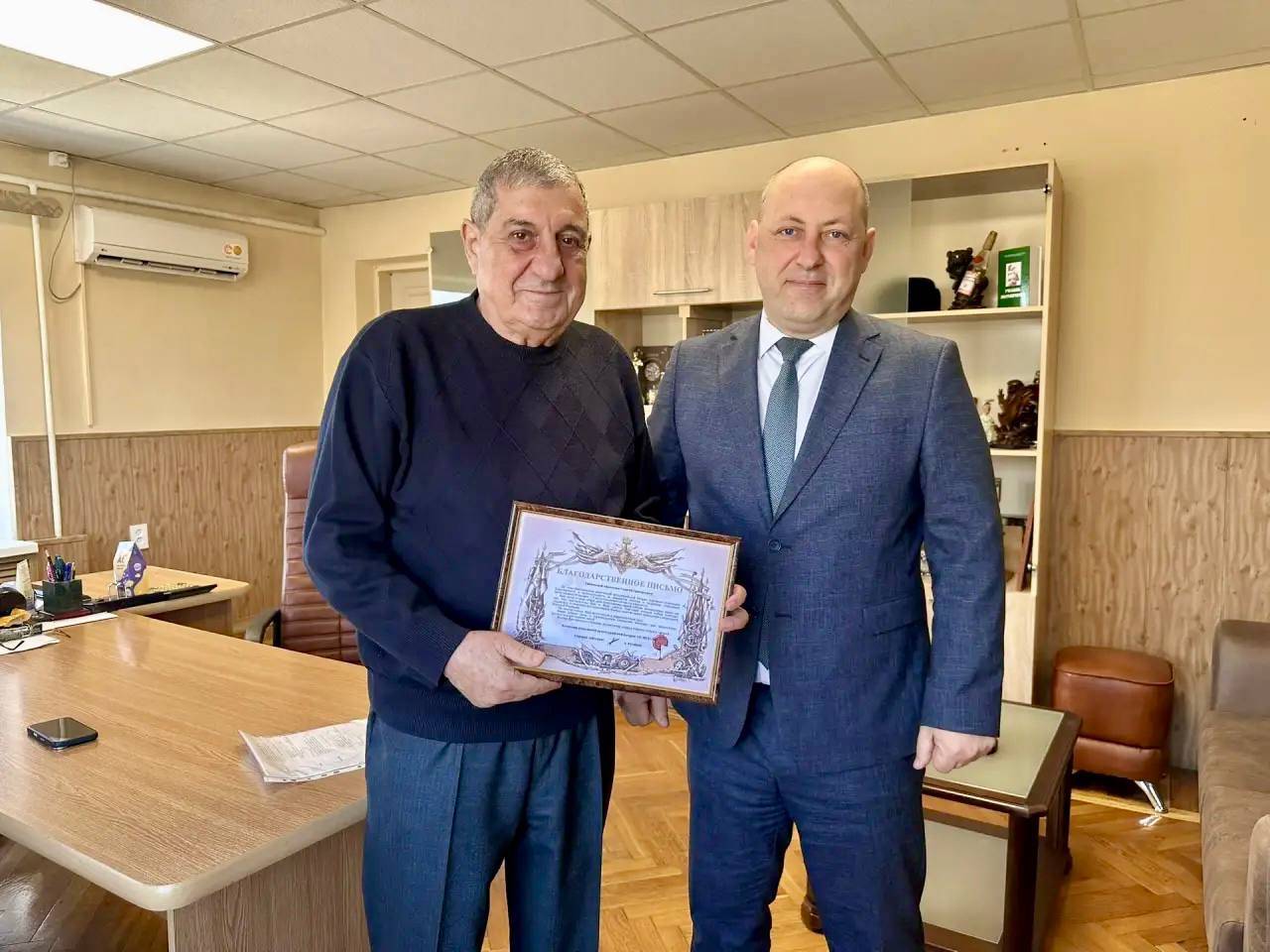 В Георгиевском муниципальном округе сразу два жителя получили благодарственные письма Министерства обороны Российской Федерации: Айрапетян Г.Г., руководитель ООО «Сфера-М», почётный гражданин Георгиевского муниципального округа, и Петрухин О.Н., руководитель СХП «Плодородие». С первых дней Специальной военной операции они помогают военнослужащим приближать победу, активно участвуют в общественной жизни, в реализации проектов, связанных с благоустройством территорий, поддерживают семьи участников СВО. Председатель Думы Георгиевского муниципального округа Стрельников А.М., член Местного отделения РО РВИО СК в Георгиевском муниципальном округе (председатель – Алексина Е.Ю.) вручил землякам заслуженные награды и поблагодарил за активное участие в жизни округа.
