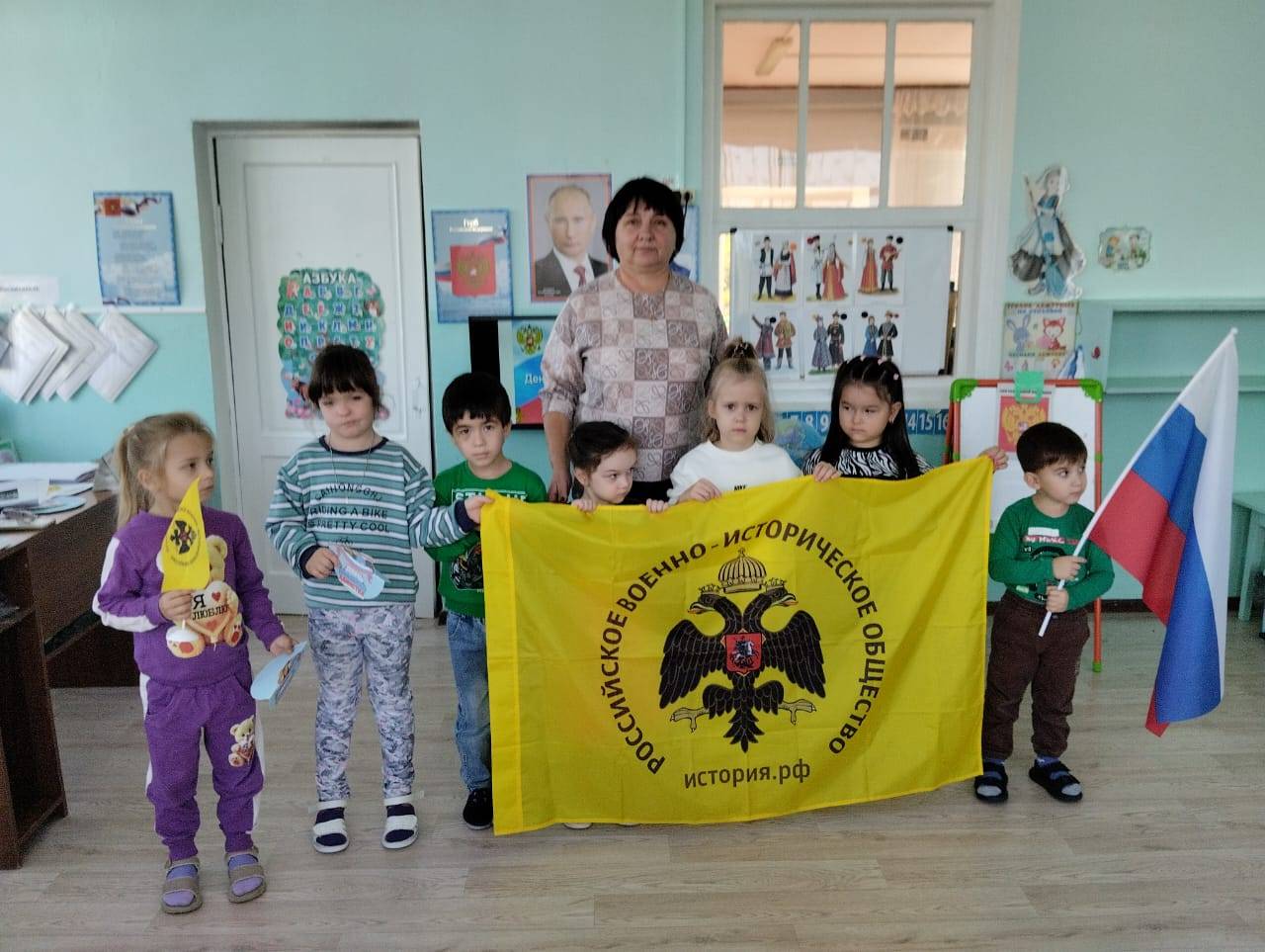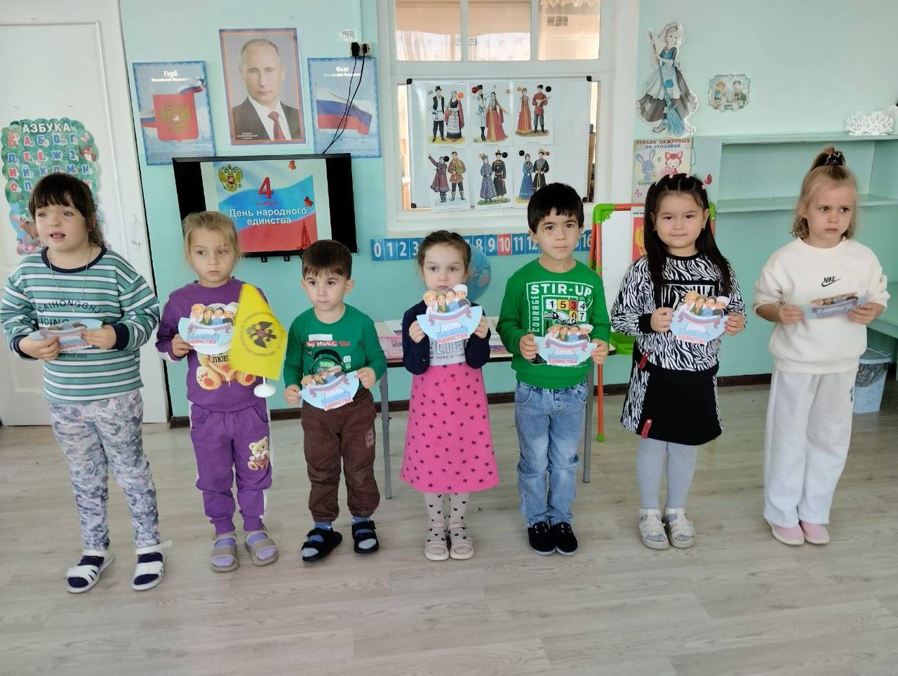 В МДОУ детском саду с. Родниковского (заведущая – Туз И.А., член РО РВИО СК) прошли тематические мероприятия, объединённые одной темой – «День народного единства». В ходе мероприятий дети прослушали гимн нашей страны и в доступной форме познакомились с историей возникновения праздника. Ребята вспомнили о том, как велика и красива наша Родина. Воспитатель Андрющенко И.Н., член РО РВИО СК, рассказала, как богата событиями история нашей страны. Воспитанники закрепили свои знания о государственных символах, узнали о традициях других народов, проживающих на территории России, играли и изготовили поздравительные открытки на тему «День народного единства». В конце дня праздничные открытки ребята подарили родителям.