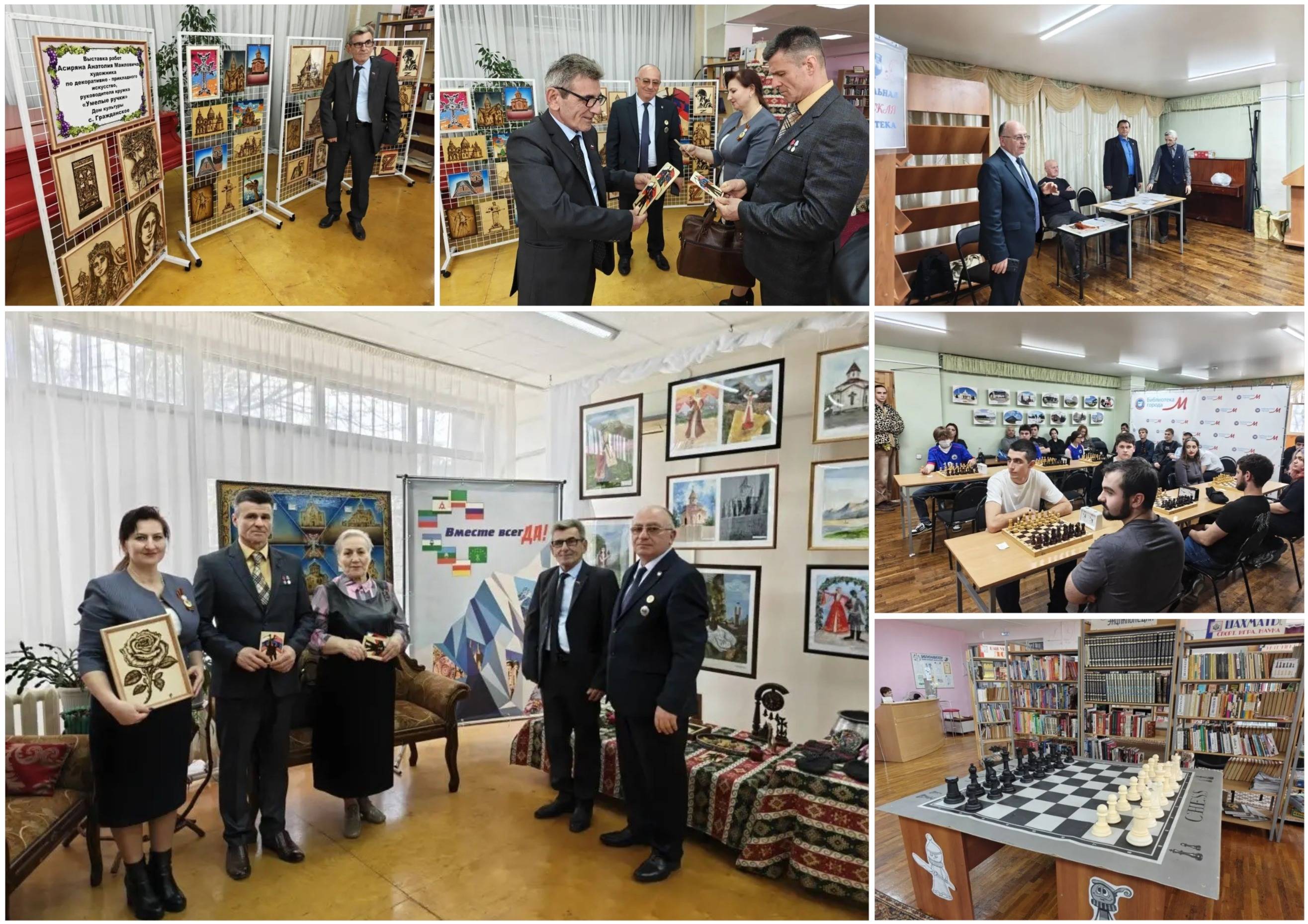 Завершающей частью мероприятия стало посещение гостями Центральной городской библиотеки им. Р.Н. Котовской г. Минеральные Воды, значительная часть коллектива которой является членами РО РВИО СК. Здесь собравшимся была представлена персональная выставка художника А.М. Асиряна, руководителя кружка «Умелые ручки» Дома культуры с. Гражданского, а для молодёжи организован шахматный турнир.