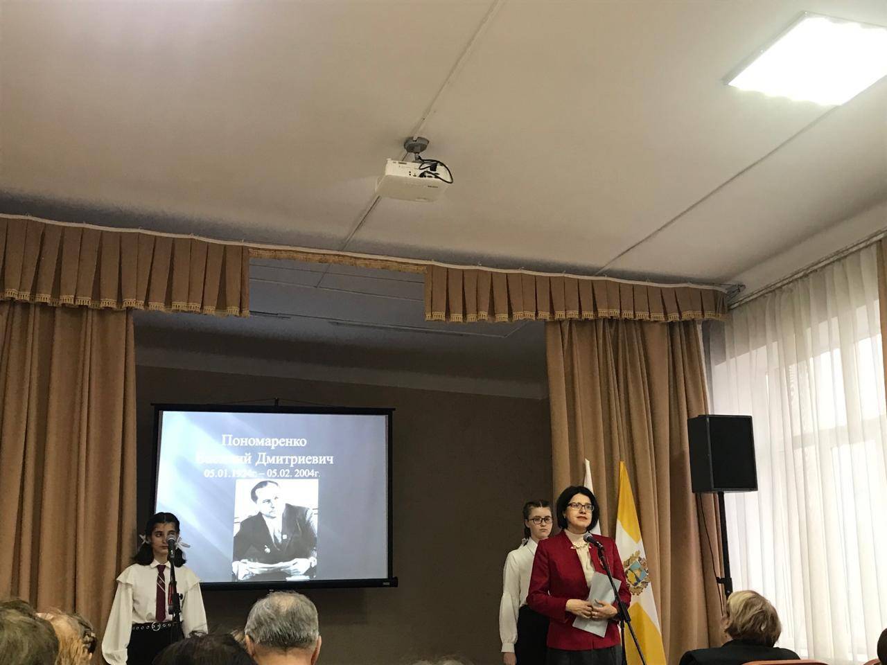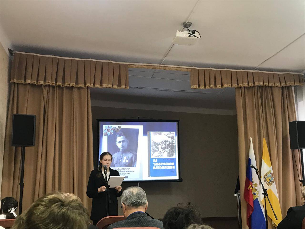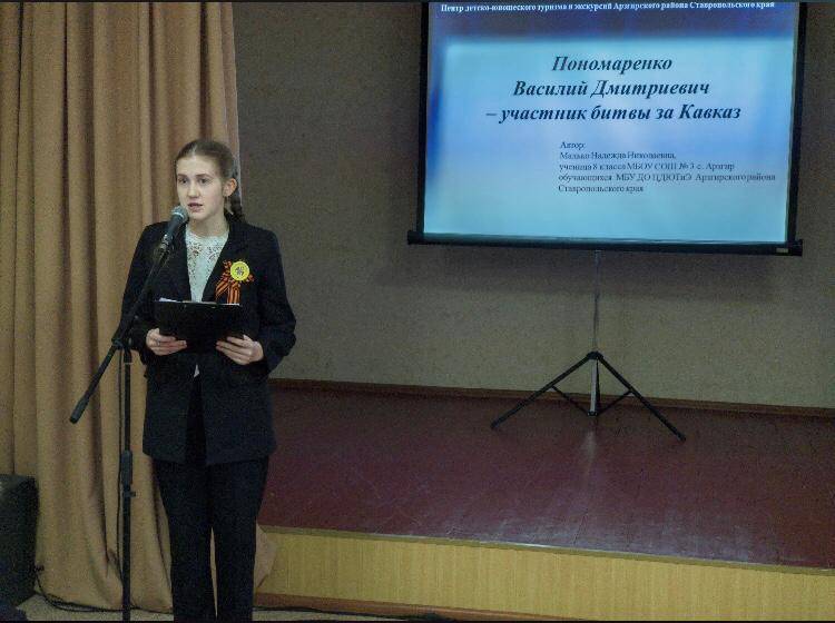 На мероприятии с докладом о В.Д. Пономаренко выступила Надежда Малько, ученица 8 класса МБОУ СОШ №3 с. Арзгир, член клуба «Юный патриот» РО РВИО СК, воспитанница Центра детско-юношеского туризма и экскурсий с. Арзгир (директор – О.Е. Гончаренко, председатель Местного отделения РО РВИО СК). Она рассказала гостям мероприятия о боевом пути Василия Дмитриевича, о его участии в Битве за Кавказ, о подвигах и наградах.