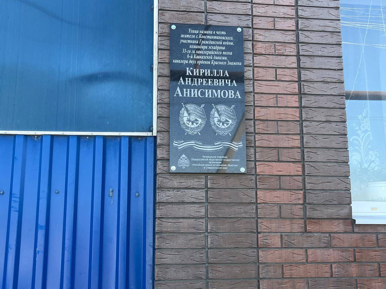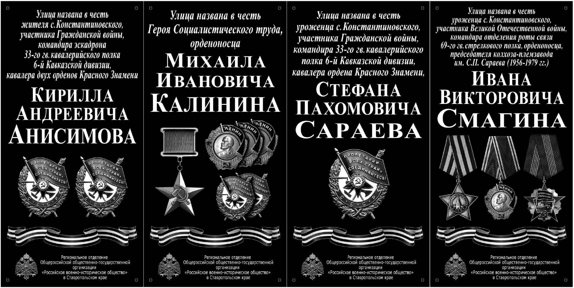 24 сентября 2024 г. в с. Константиновском Петровского муниципального округа Ставропольского края состоялись церемонии торжественного открытия четырёх мемориальных досок, которые были изготовлены по инициативе Ставропольского регионального отделения Российского военно-исторического общества (РО РВИО СК) в рамках многокластерного проекта «Воспитание историей», реализуемого при поддержке Министерства молодежной политики Ставропольского края. Одним из кластеров данного проекта является направление «Улица Героя».