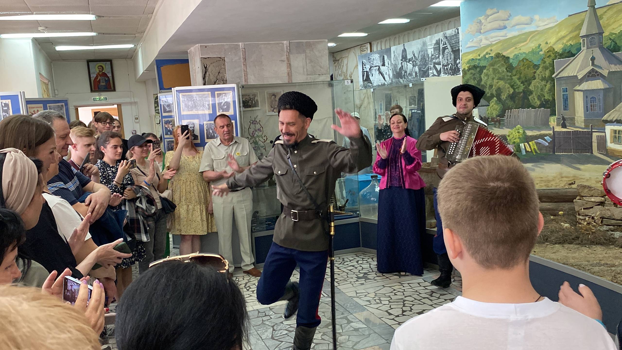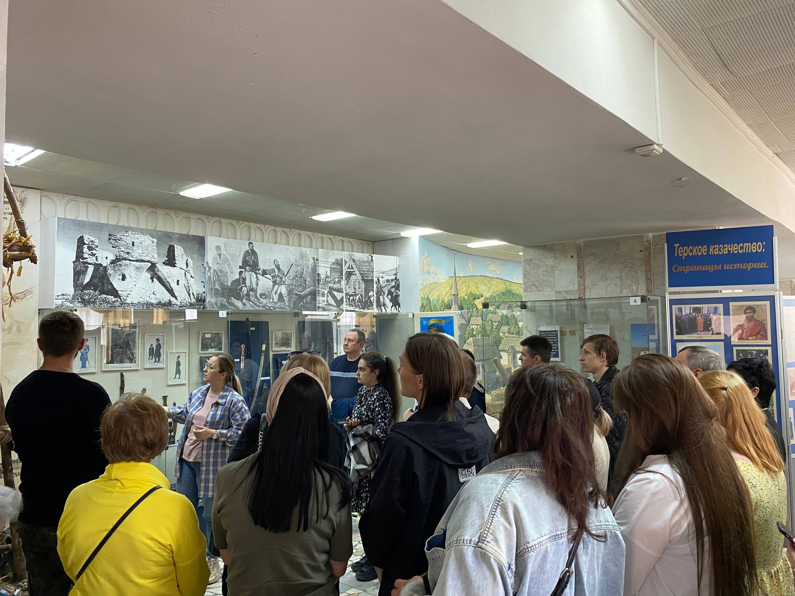 Вели экскурсию Каменева Г.Н., к.и.н., зав. отделом военной истории и патриотической работы СГМЗ, исполнительный директор РО РВИО СК, Гордиенко А.Б., к.и.н., зав. отделом этнографии СГМЗ, член РО РВИО СК, Есаулова Г.А., мл. научный сотрудник отдела истории казачества СГМЗ, Стрелова А.В., председатель Местного отделения РО РВИО СК в Труновском муниципальном округе.