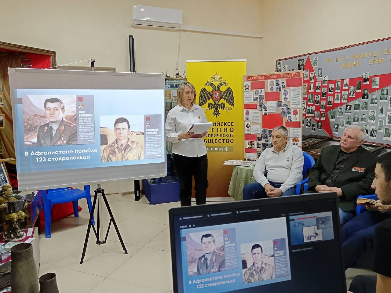 Сотрудники музея, члены Ставропольского регионального отделения Российского военно-исторического общества (РО РВИО СК), рассказали школьникам о причинах ввода советских солдат на территорию Афганистана в декабре 1979 г., познакомили их с особенности боевых действий в ходе войны. Школьникам были продемонстрированы тематические видеоматериалы о земляках-участниках Афганской войны, награды, документы, фотографии и личные вещи бойцов. Особый разговор шёл о погибшем в той войне Громове Александре (1965–1984), уроженце х. Тимофеевского.