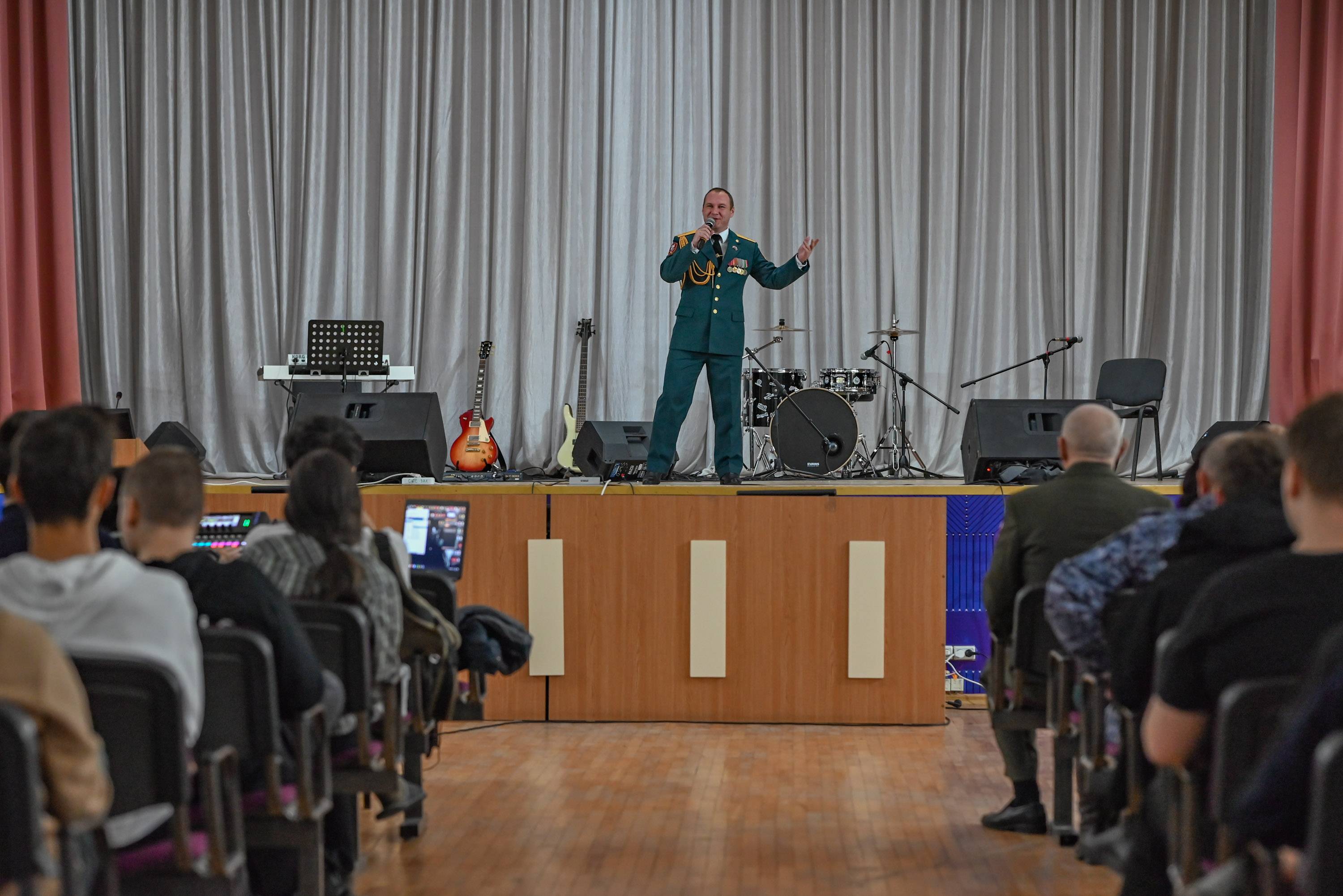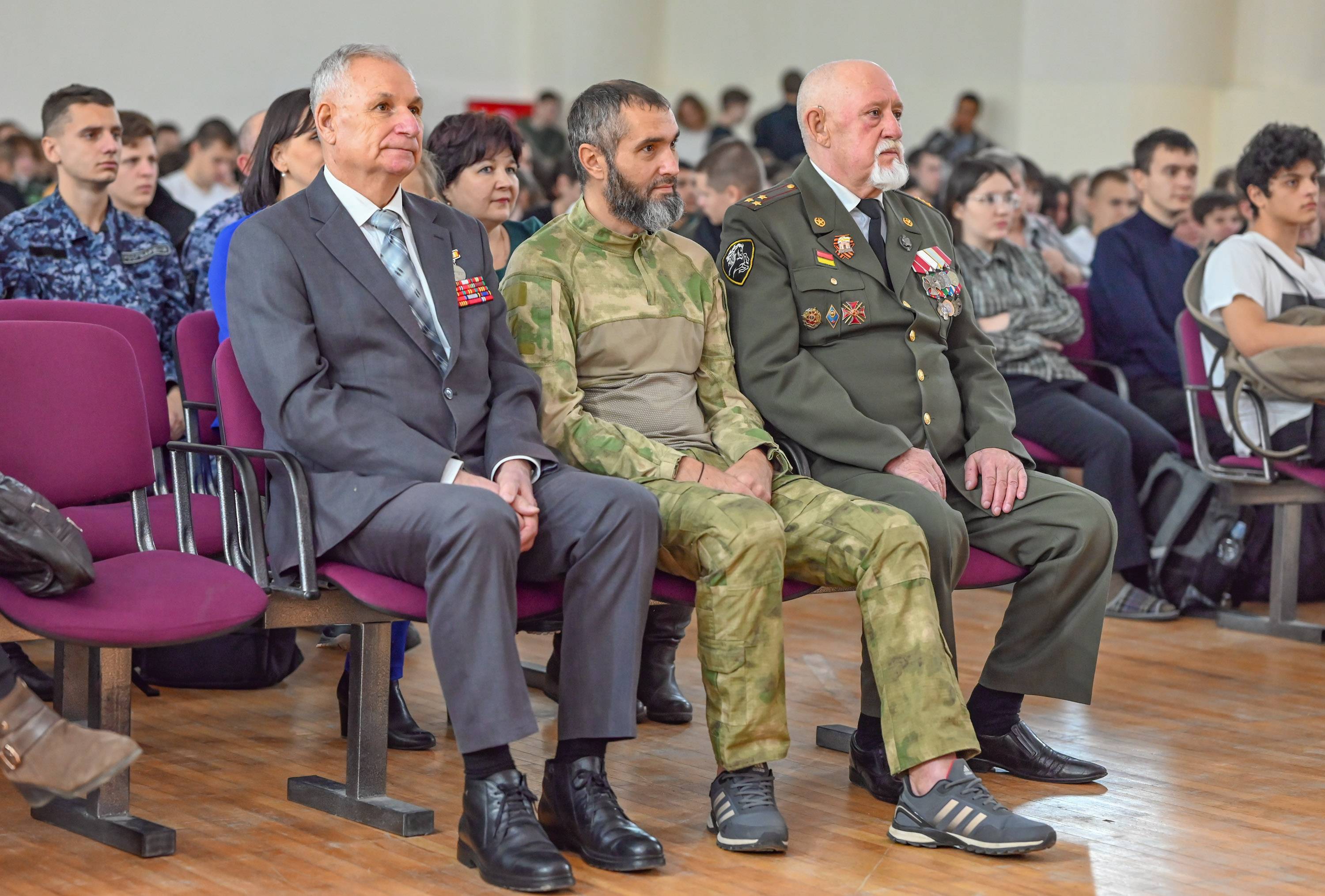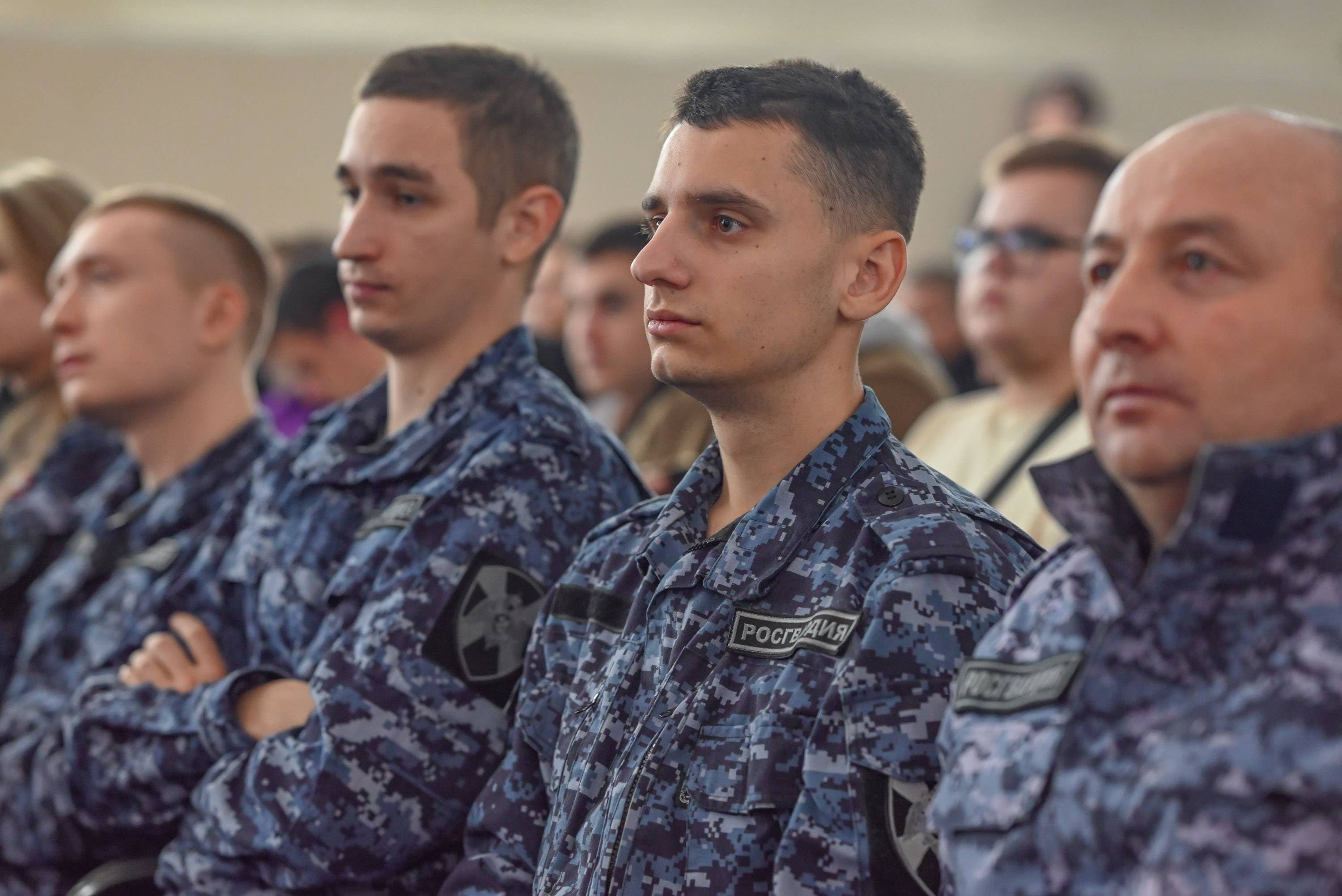 Концертный зал учебного заведения собрал учащихся, педагогический состав, почетных работников образовательного учреждения, сотрудников и военнослужащих Росгвардии, а также ветеранов войск правопорядка.