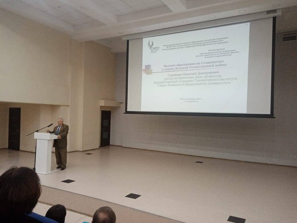 С докладом на пленарном заседании выступил Судавцов Н.Д., д.и.н., профессор, ведущий научный сотрудник Гуманитарного института СКФУ, главный научный сотрудник отдела военной истории и патриотической работы Ставропольского государственного музея-заповедника (СГМЗ), один из учредителей РО РВИО СК. Он рассказал о высшем образовании на Ставрополье в период Великой Отечественной войны.