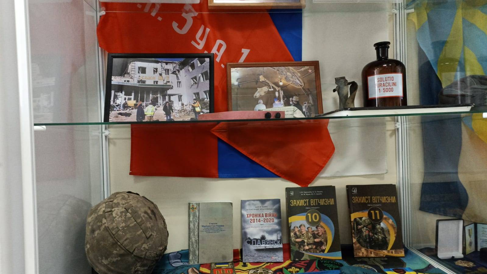 Экспозиция состоит из фотографий, отражающих работу медицинской службы, трофейной символики, литературы и других предметов военного и медицинского назначения.