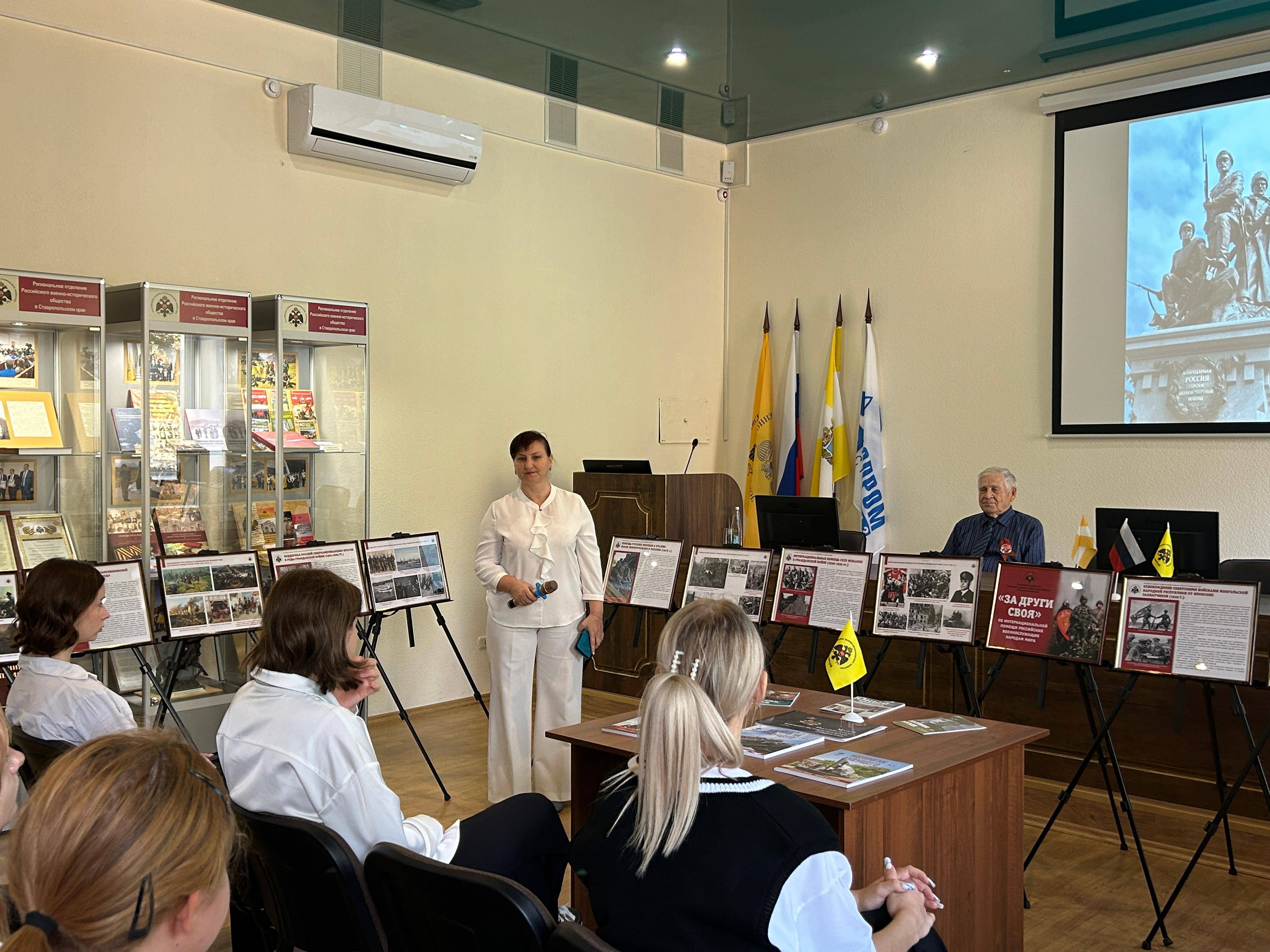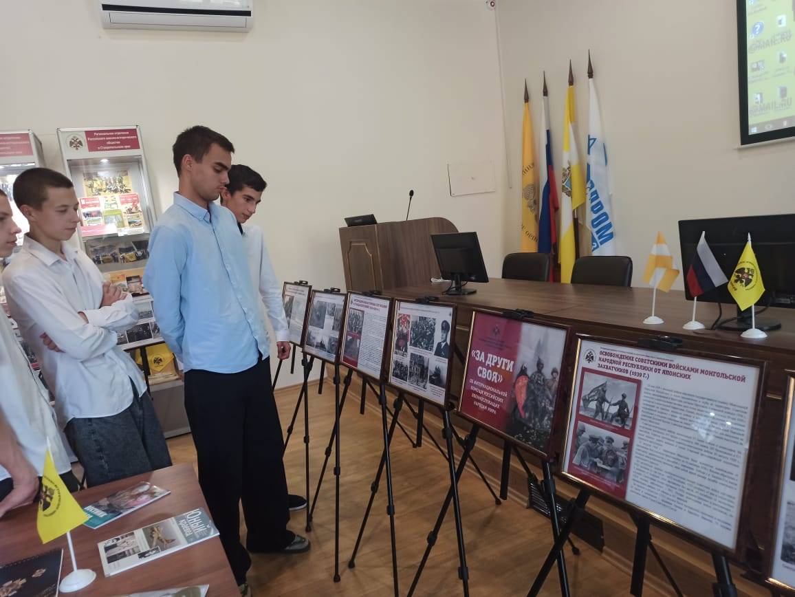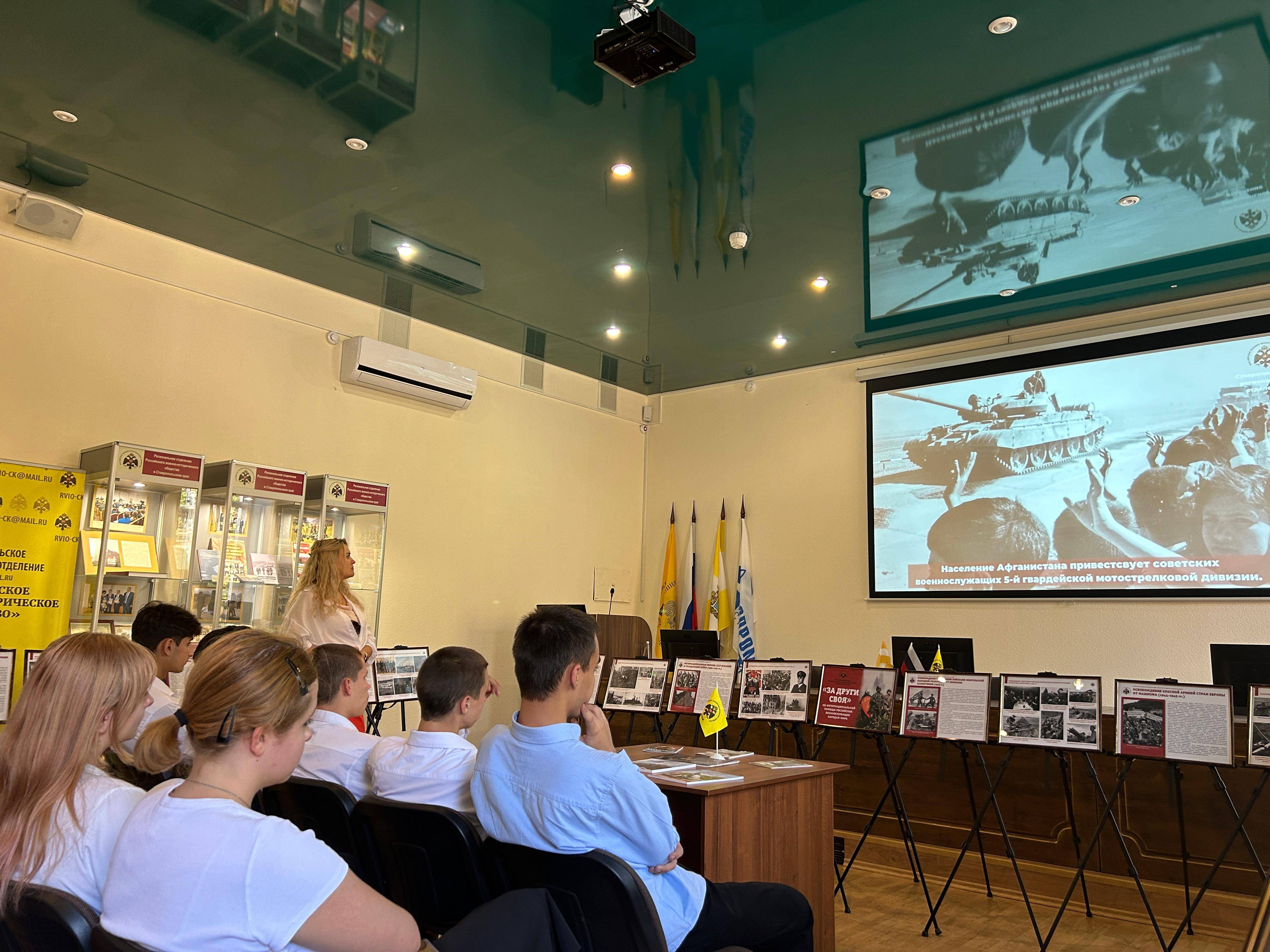 05 сентября 2024 г. на базе конференц-зала Ставропольского регионального отделения Российского военно-исторического общества (РО РВИО СК) (председатель – Шевелёв С.А.) учащейся молодёжи был презентован выставочный проект «За други своя», посвящённый интернациональной помощи российских военнослужащих народам мира. Передвижная выставка была подготовлена сотрудниками отдела военной истории и патриотической работы СГМЗ совместно с представителями РО РВИО СК в рамках проекта «Воспитание историей» при поддержке Министерства молодежной политики Ставропольского края. В числе экскурсантов был представители РДДМ «Движение первых» Ставропольского края (председатель – Головин Г.П., член РО РВИО СК), учащиеся МБОУ гимназии №12 им. Белоконя В.Э. (под руководством педагога Бесединой Т.В.).