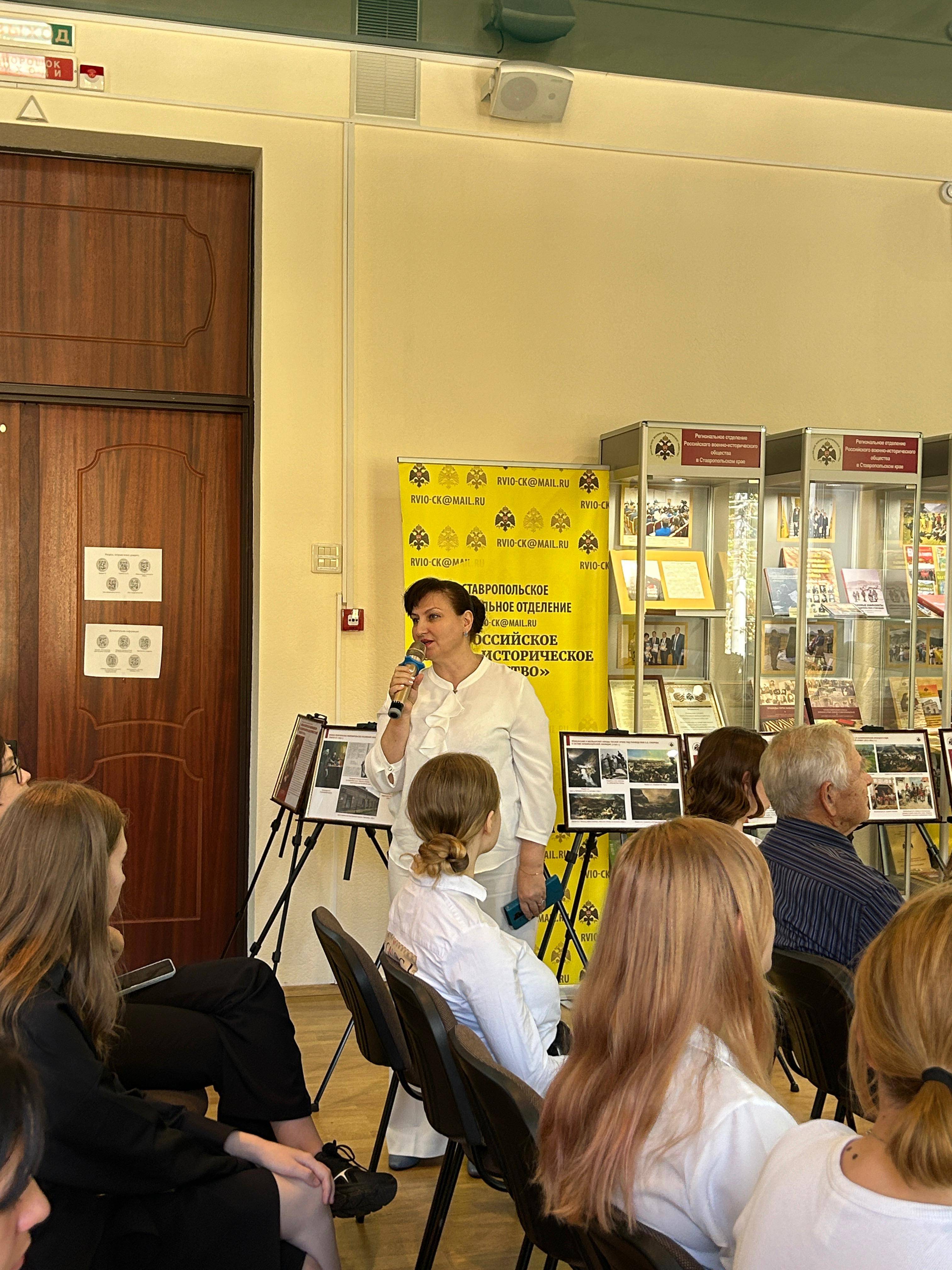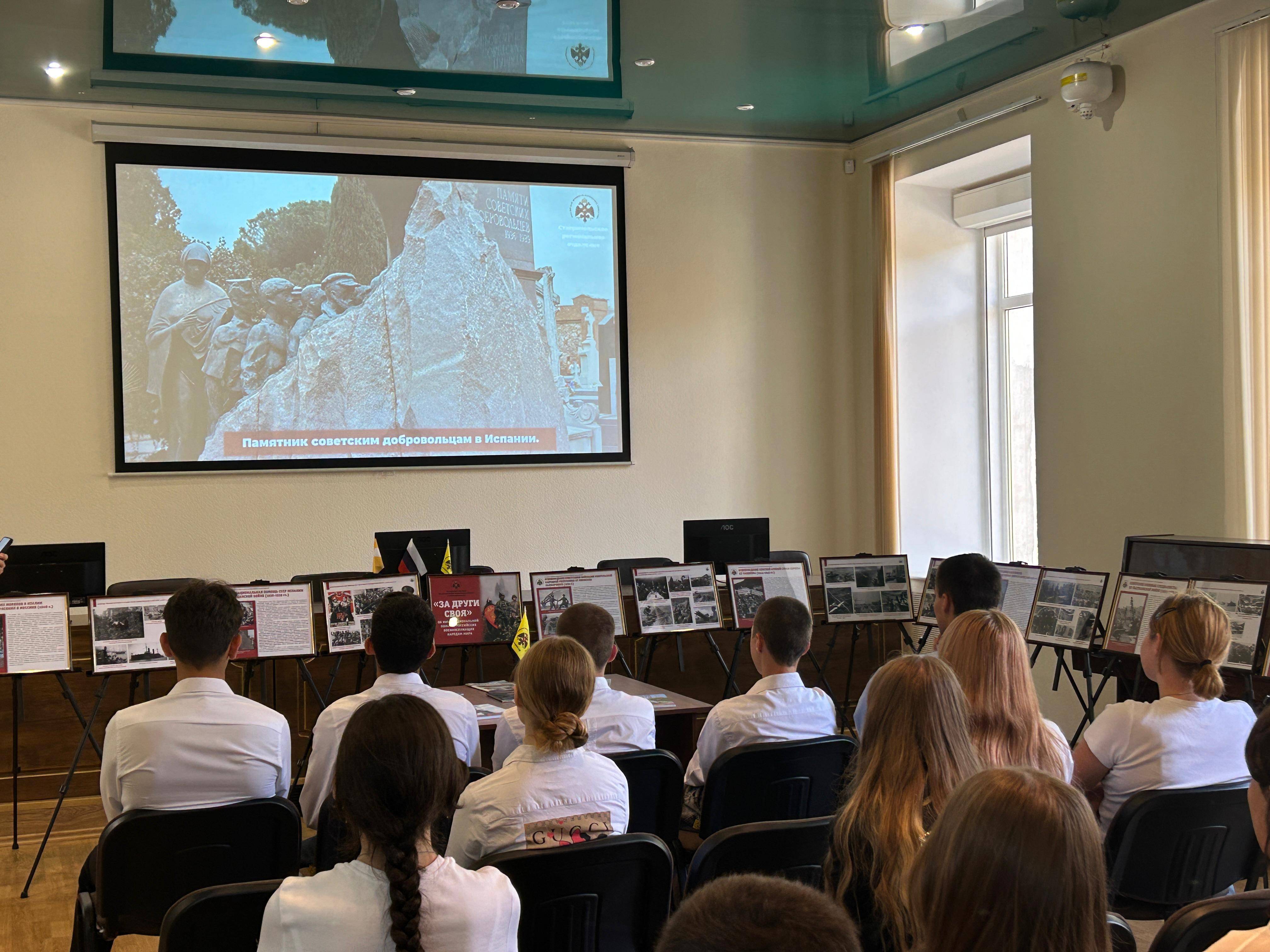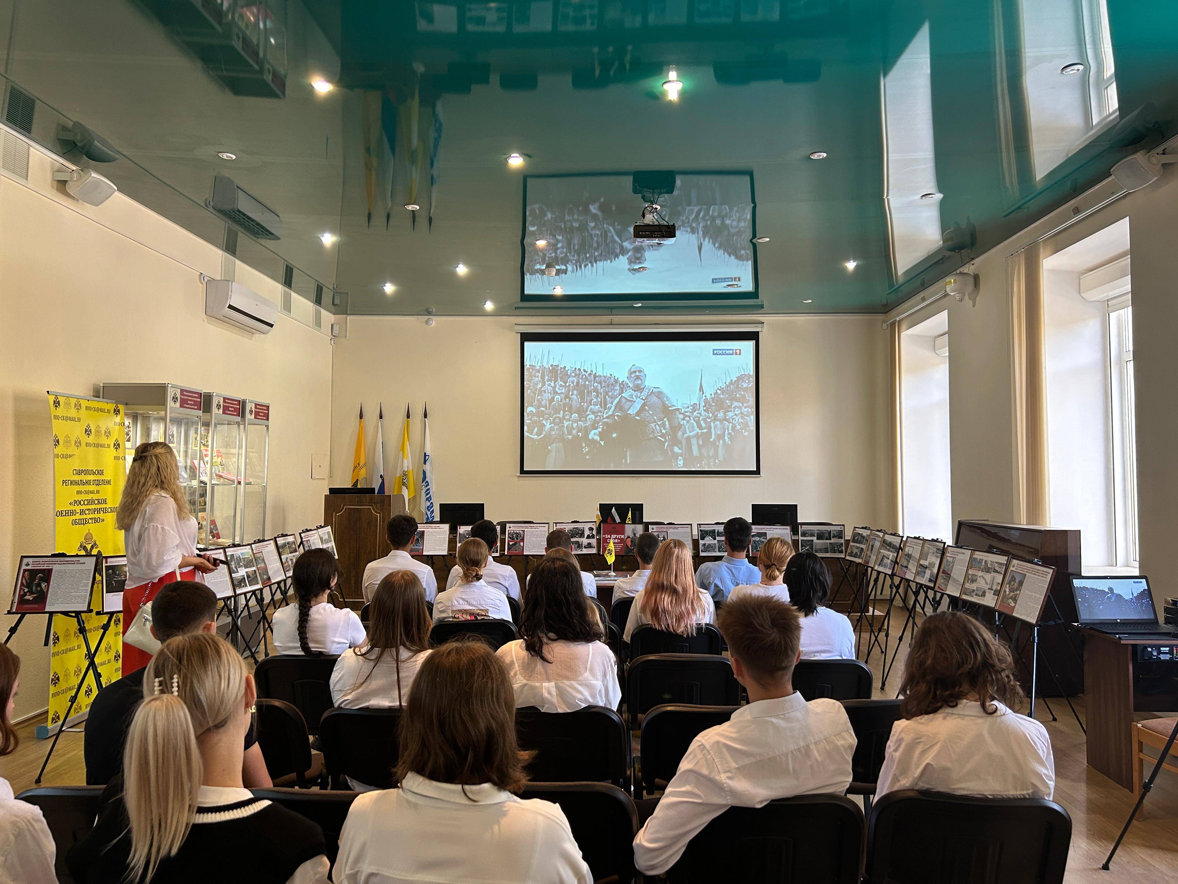 05 сентября 2024 г. на базе конференц-зала Ставропольского регионального отделения Российского военно-исторического общества (РО РВИО СК) (председатель – Шевелёв С.А.) учащейся молодёжи был презентован выставочный проект «За други своя», посвящённый интернациональной помощи российских военнослужащих народам мира. Передвижная выставка была подготовлена сотрудниками отдела военной истории и патриотической работы СГМЗ совместно с представителями РО РВИО СК в рамках проекта «Воспитание историей» при поддержке Министерства молодежной политики Ставропольского края. В числе экскурсантов был представители РДДМ «Движение первых» Ставропольского края (председатель – Головин Г.П., член РО РВИО СК), учащиеся МБОУ гимназии №12 им. Белоконя В.Э. (под руководством педагога Бесединой Т.В.).