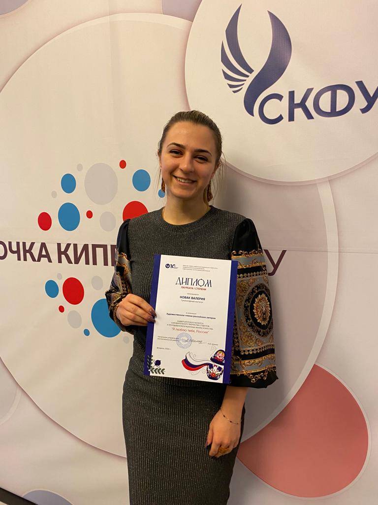 С 10 января по 10 февраля 2022 г. на базе Северо-Кавказского федерального университета (СКФУ) проходил творческий конкурс «Я люблю тебя, Россия!», в котором приняла участие и стала лауреатом 1 степени Валерия Новак, магистр 2 курса СКФУ, младший научный сотрудник отдела военной истории и патриотической работы Ставропольского государственного музея-заповедника, член Ставропольского регионального отделения Российского военно-исторического общества.