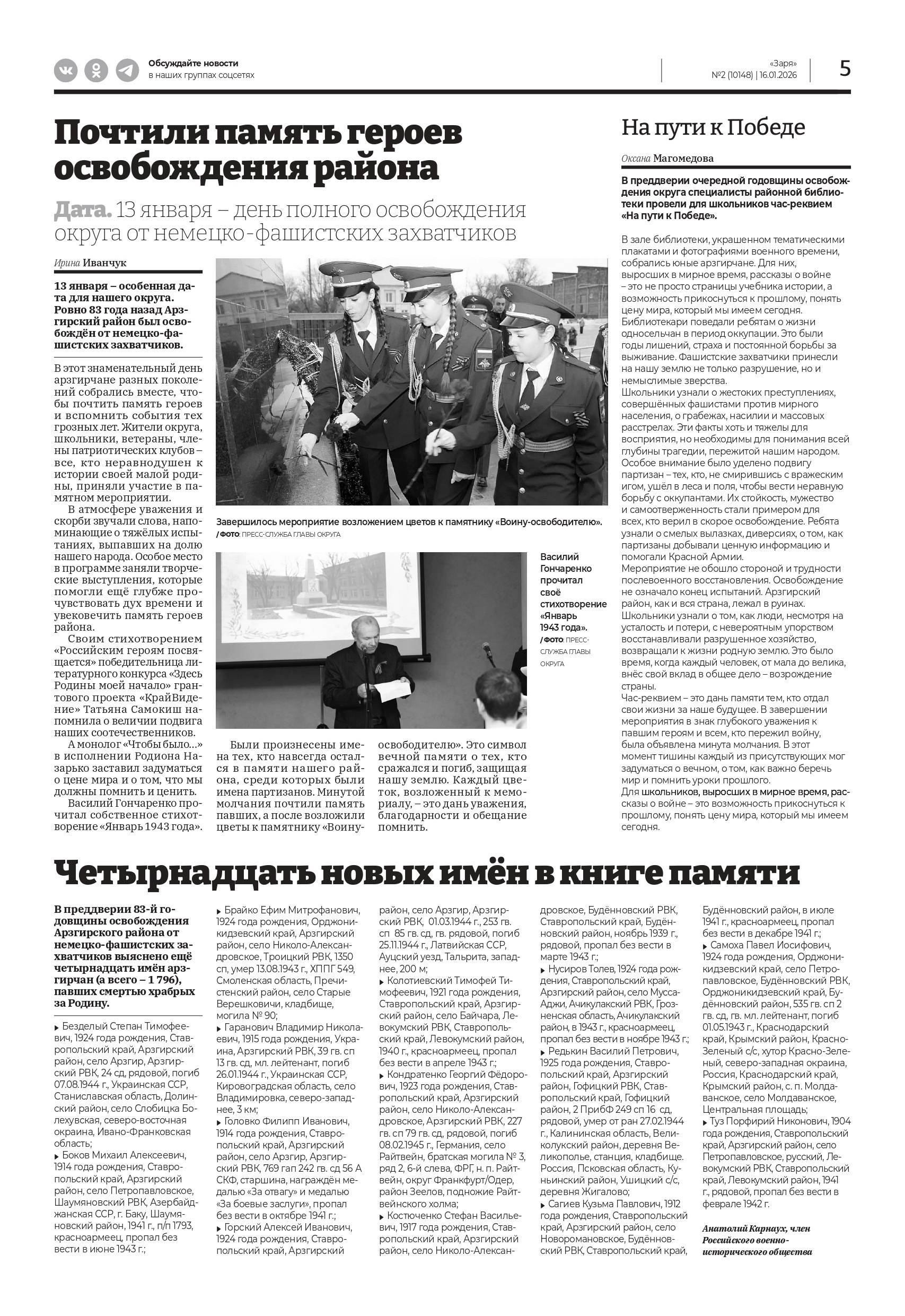 К 83-й годовщине освобождения Арзгирского района от немецко-фашистских захватчиков в выпуске газеты «Заря» от 16 января 2026 г. была опубликована статья «Четырнадцать новых имён в книге памяти». В материале приводятся имена 14 земляков, павших на полях сражений Великой Отечественной войны. Установить их имена удалось благодаря исследовательской работе А.Г. Карнауха – журналиста, члена Союза журналистов России, члена Местного отделения РО РВИО СК в Арзгирском муниципальном округе (председатель – Гончаренко О.Е.).