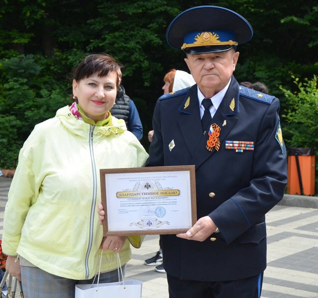 Председателю СКРО «Российский совет ветеранов пограничной службы» Соловьёву П.В. и активисту Лесных А.А. от РО РВИО СК были вручены благодарственные письма и видеоматериалы РВИО для просветительской работы с подрастающим поколением. В канун праздника, 27 мая 2024 г., для курсантов Голицынского пограничного института ФСБ России от Ставропольского регионального отделения РВИО была проведена экскурсия «Отечественные войны в топонимике г. Ставрополя» в рамках проекта «Воспитание историей», что стало своеобразным подарком для будущих пограничников. Завершилась встреча в неформальной обстановке – в условиях полевой кухни и фотосессией.